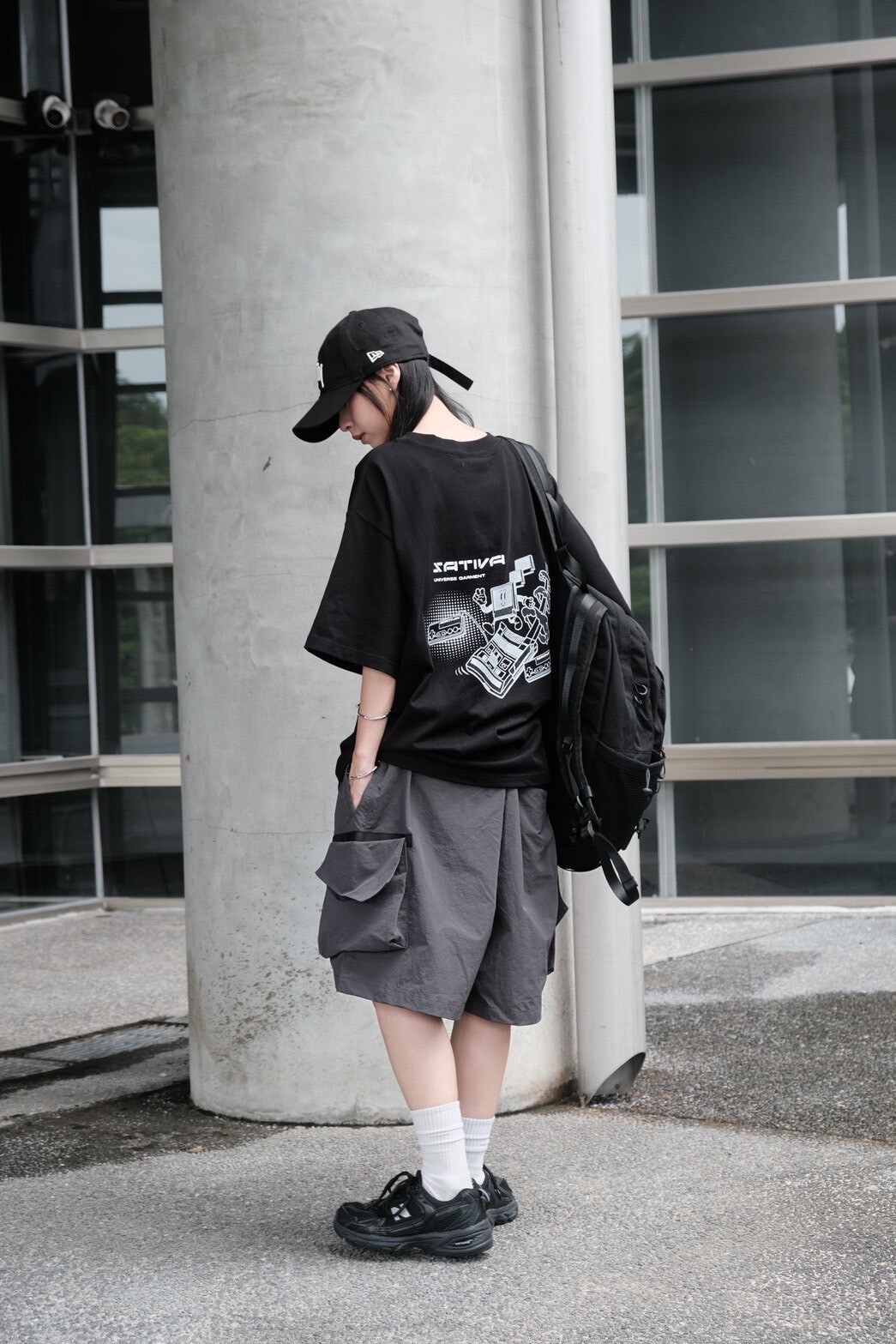 本次作品採100% Cotton 舒適透氣棉布,迎合夏季的著用需求,並給予更為立體與愜意的穿著感受;正面視覺以“Digital Fonts”形式,象徵著童年回憶以數位形式儲存,並作為銜接未來科技的通用格式。後背主視覺則以代表童年遊玩回憶經典的表徵—「紅白機」作為設計概念,以截然不同的配色靈感,營造更加屬於夏季的自然色調,嘗試將復古懷舊元素融入現代生活,並將遊戲卡匣與數位情境相互交織,從而創造屬於夏日純真無憂的遊玩記憶,同時把曾經的童心帶入街景,將回憶與當下完美串聯,共創夏日篇章。