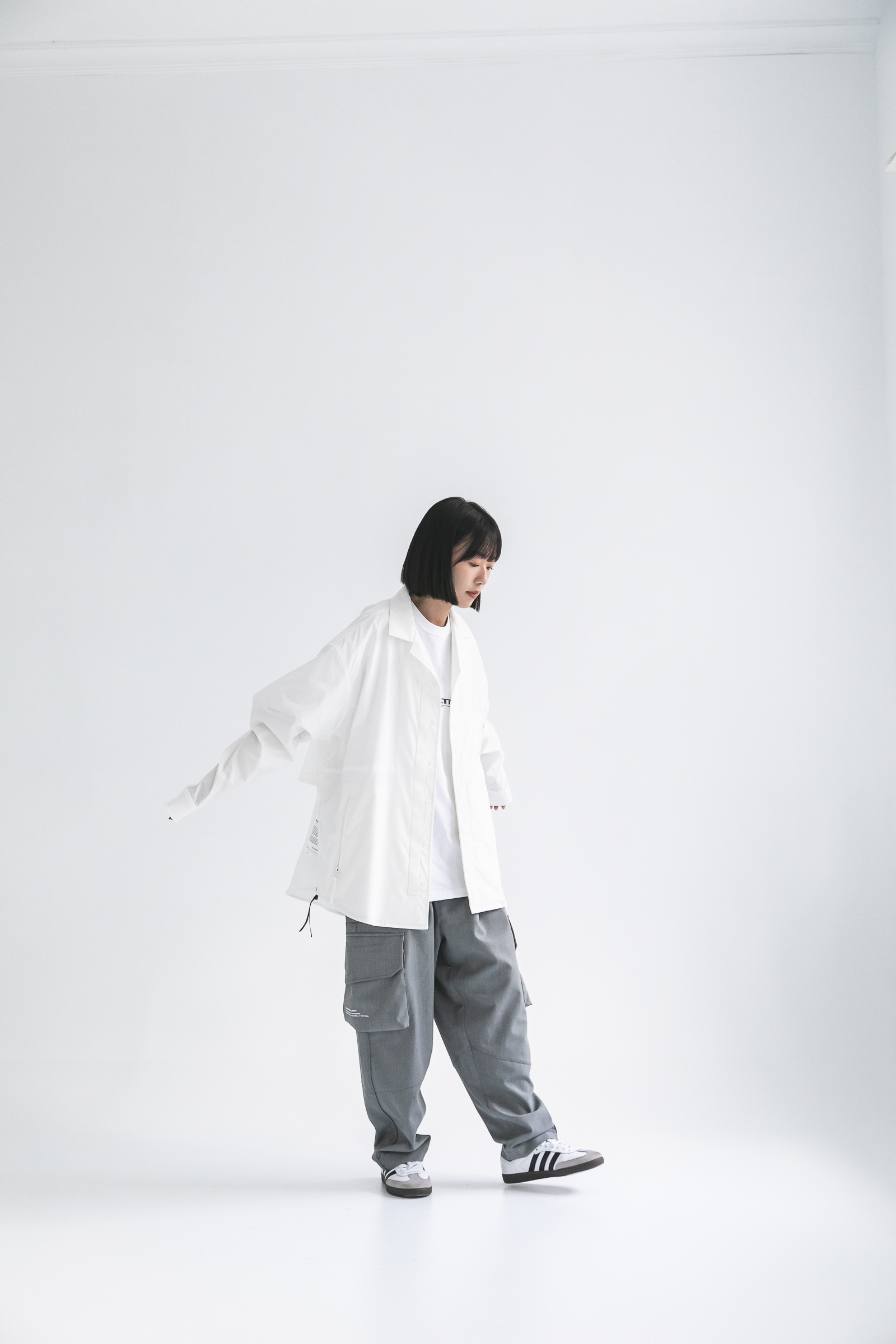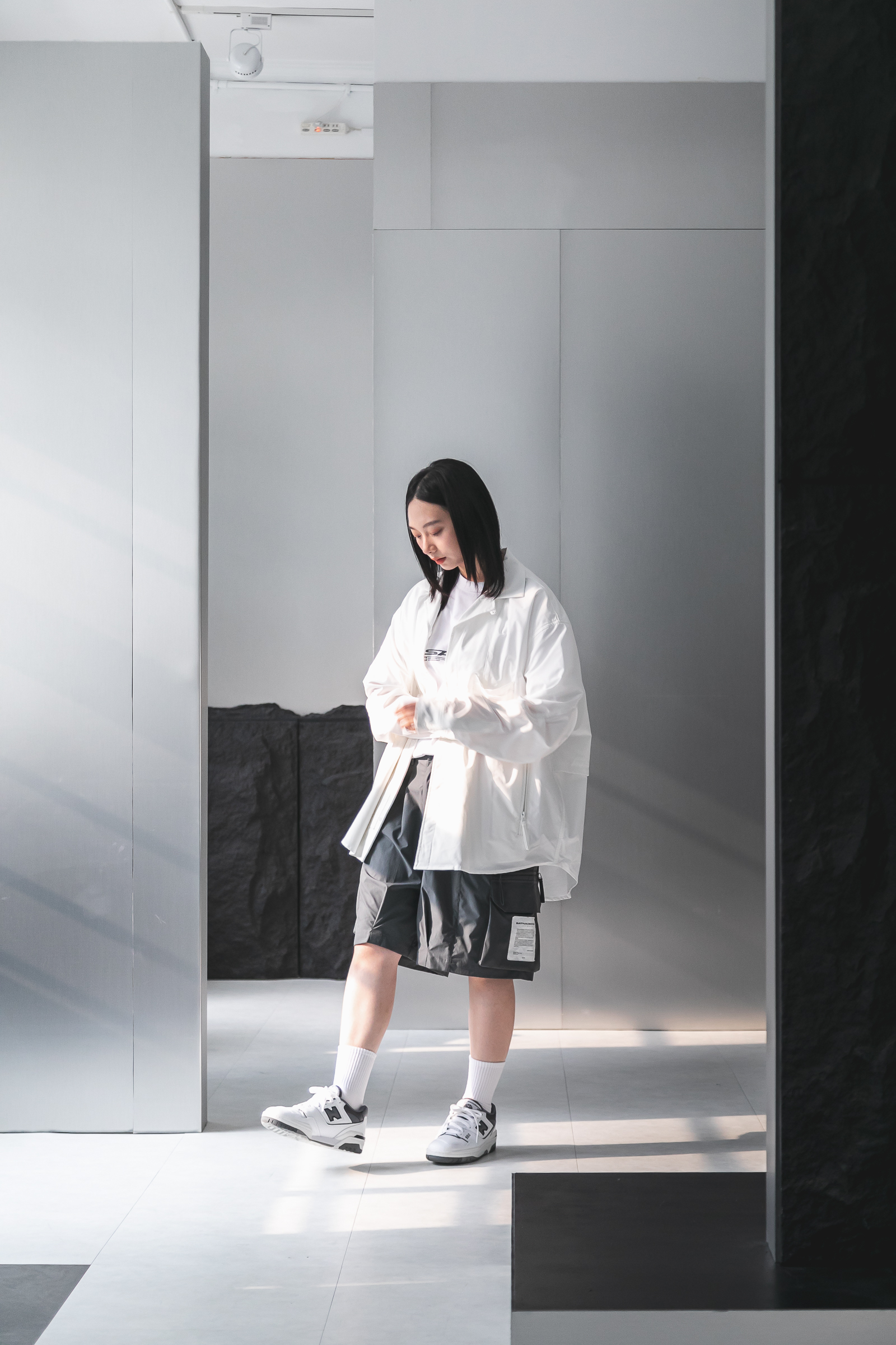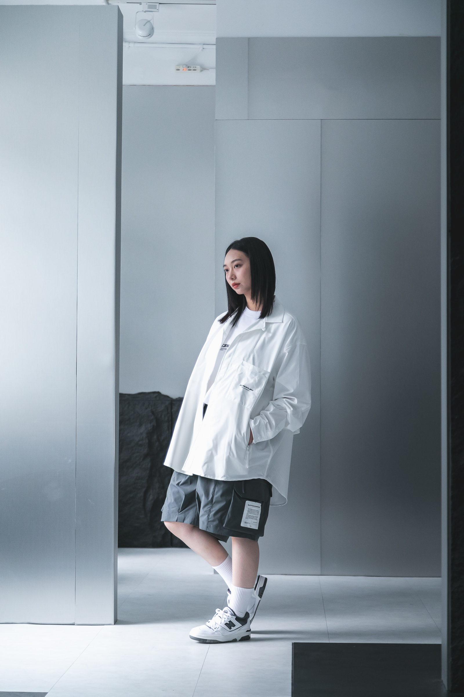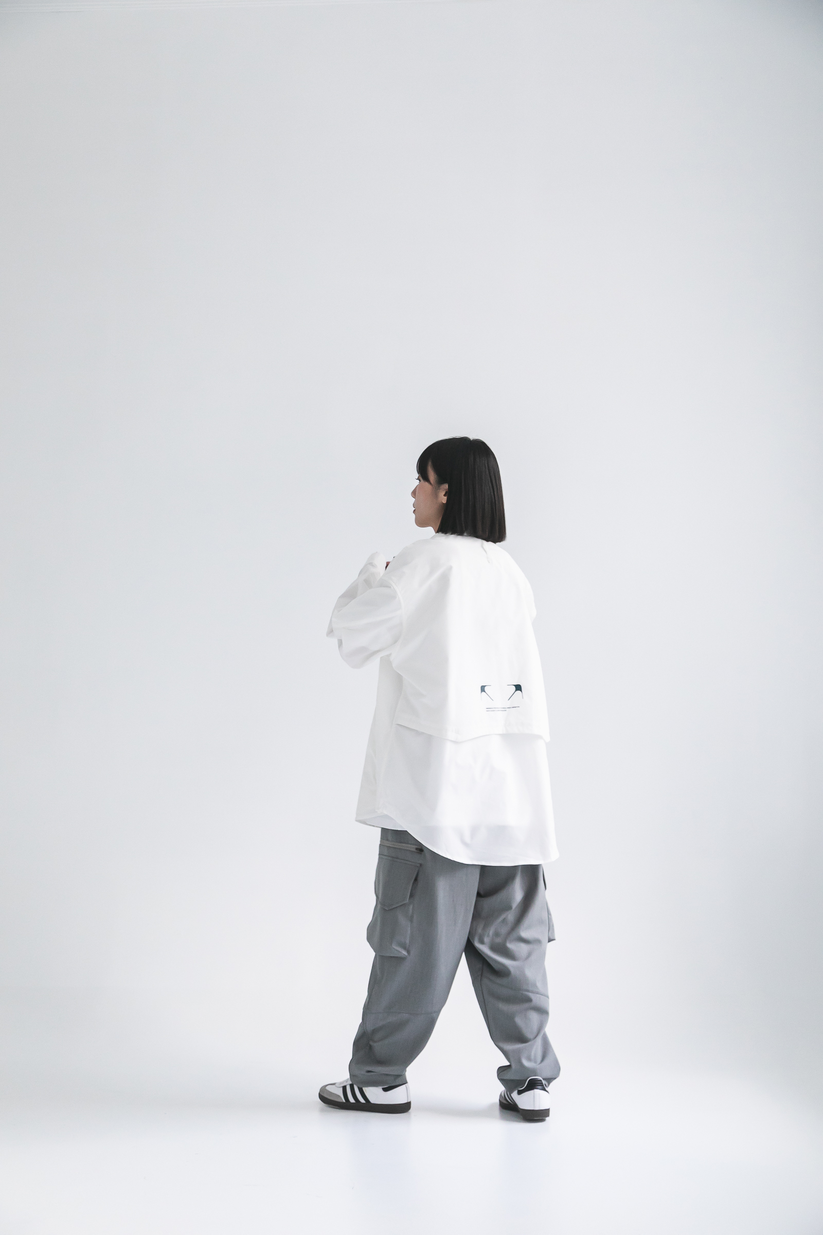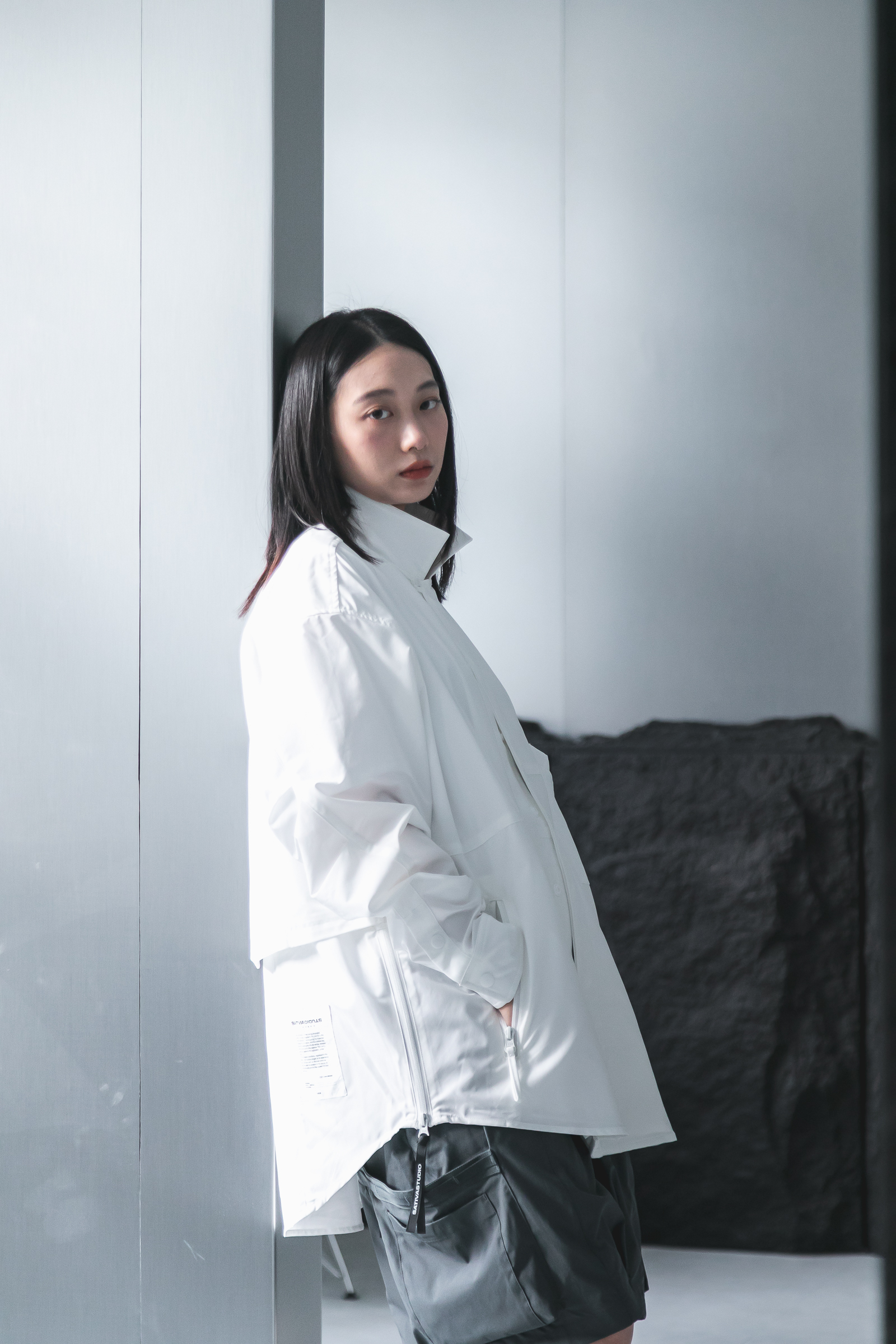 本次作品採用100% NYLON防潑水材質,輕量化面料使穿著舒適與機能性共構並存;同“TS-02”採劍領設計與門襟高密度織帶,撐起整體版型輪廓使其寬鬆自在,裁片剪裁層層疊加,體現Urban Outfit的日常城市機能體驗;左胸處配置雙層口袋設計與手袖處螺旋拼接雙打褶設計,醞釀層次的並列邏輯;後片處新增掛耳設計與不規則剪裁,搭配「維度」象徵載體的品牌Pattern,為SATIVASTUDIO提點出Urban Outfit城市機能風格,並於下擺處添加開衩拉鍊,供穿著者穿著邏輯的可延性,延續城市機能,貫徹每日始終。