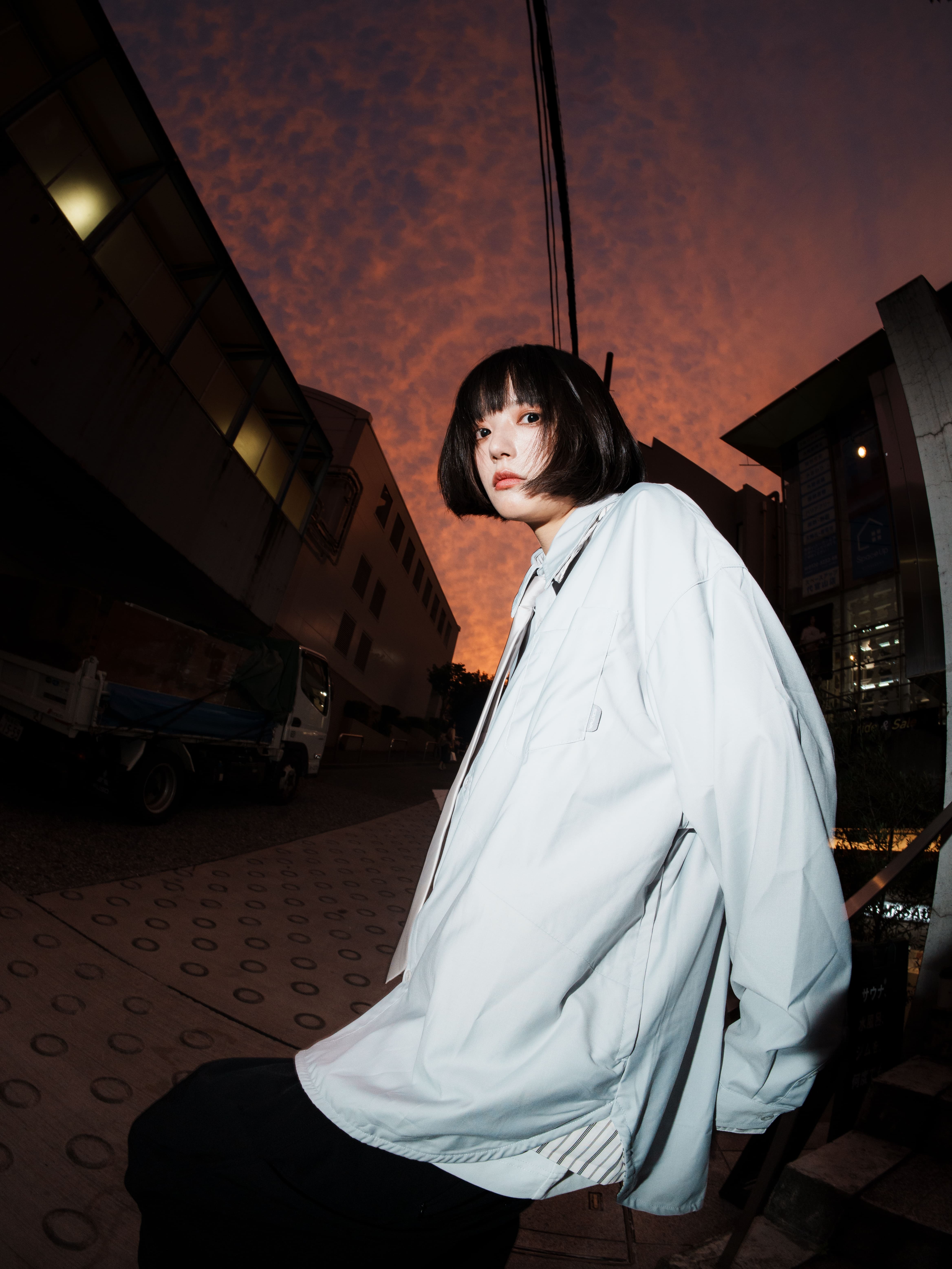 本次作品採70% Nylon以及30% Cotton混紡面料,持Nylon材質的輕薄韌性與抗皺特點之外,予以棉質衣料的透氣親膚特性。整體樣貌承接“TS-03”系列的設計,於領口處配置「雙領拼接設計」;袖口以及下襬處採用「拼布包邊設計」,使其更具穿著層次與重組意象;正身片採「弧形拼接設計」,將剪裁概念進行改造,輔以“E-01”領帶同時著用,形成拼接、剪裁與場景適用三位一體的視覺效果。最後,我們在右後側下擺處新增「拉鏈拼布設計」,讓著用者自行調整曝出效果,以期實現自由調節與隨心著用之效果。