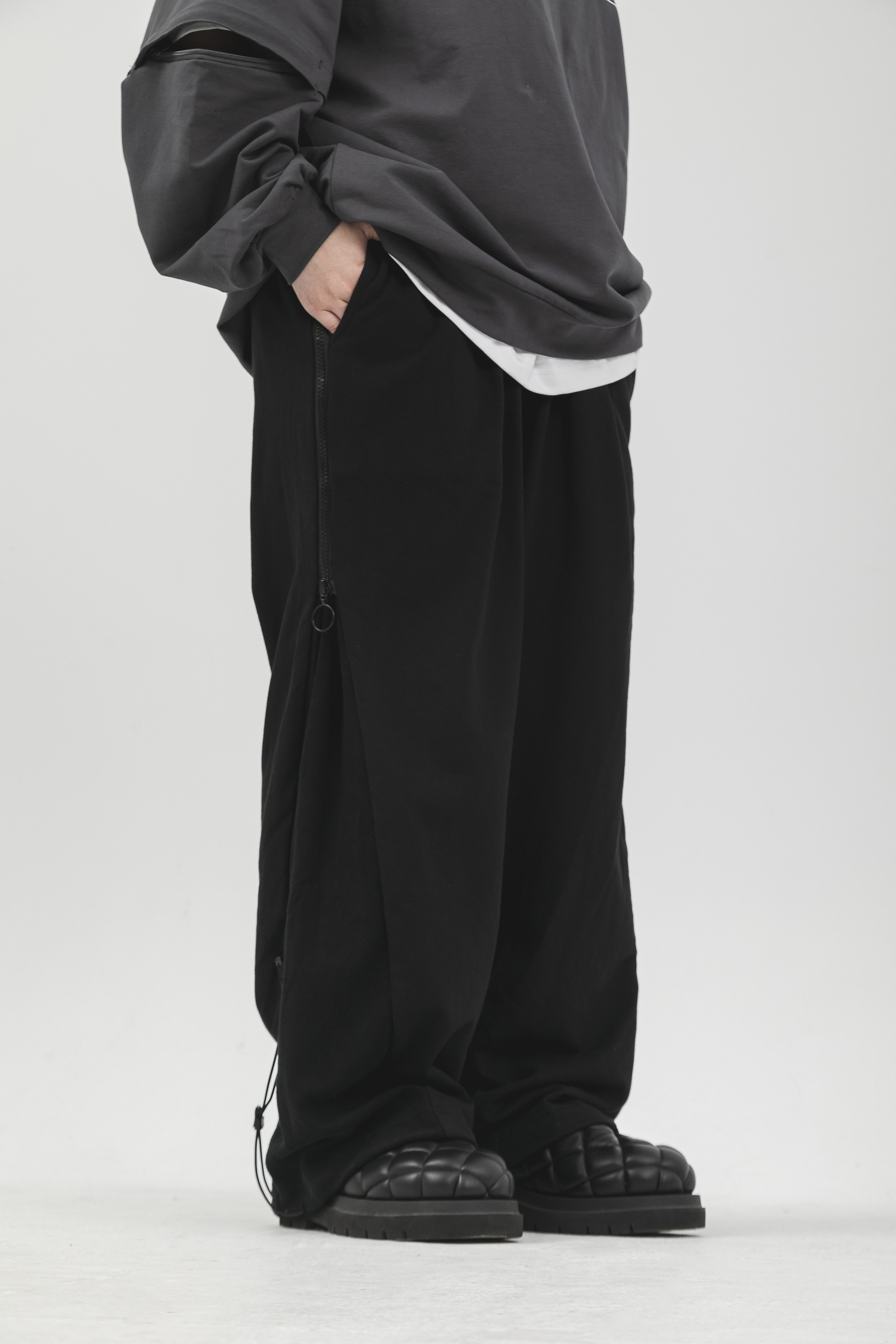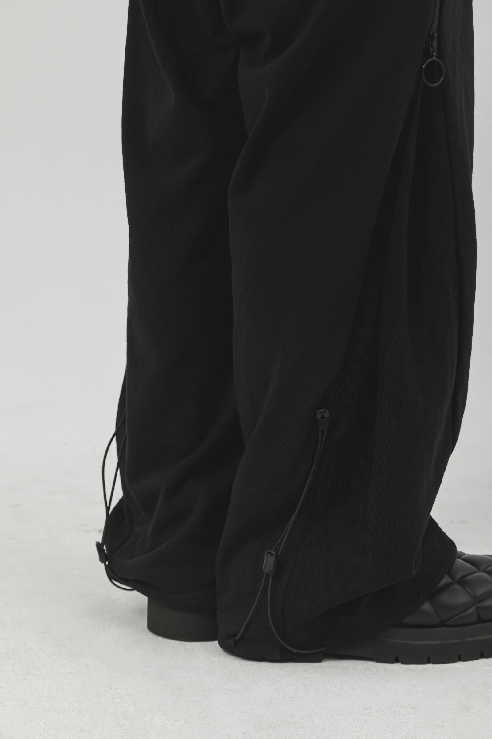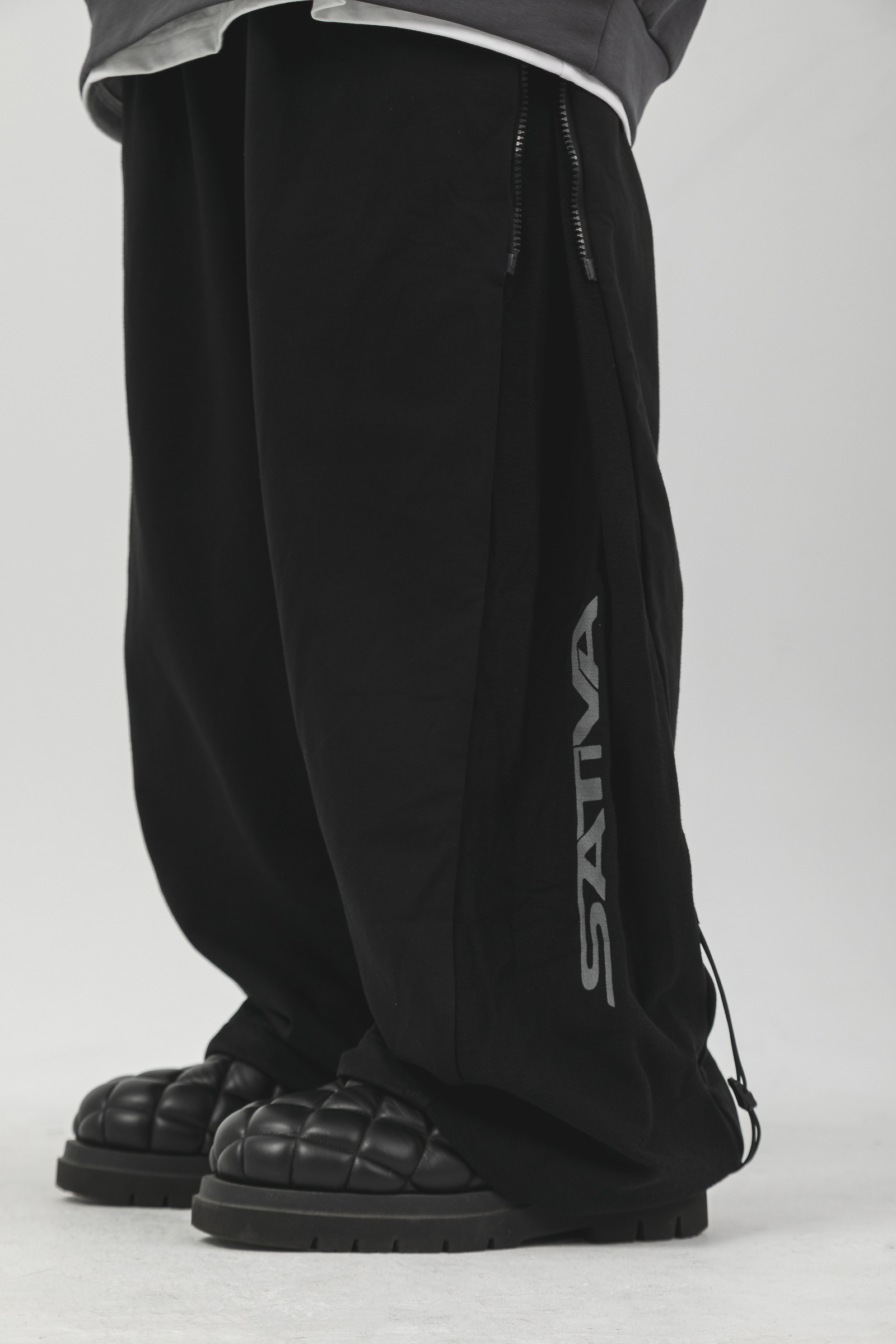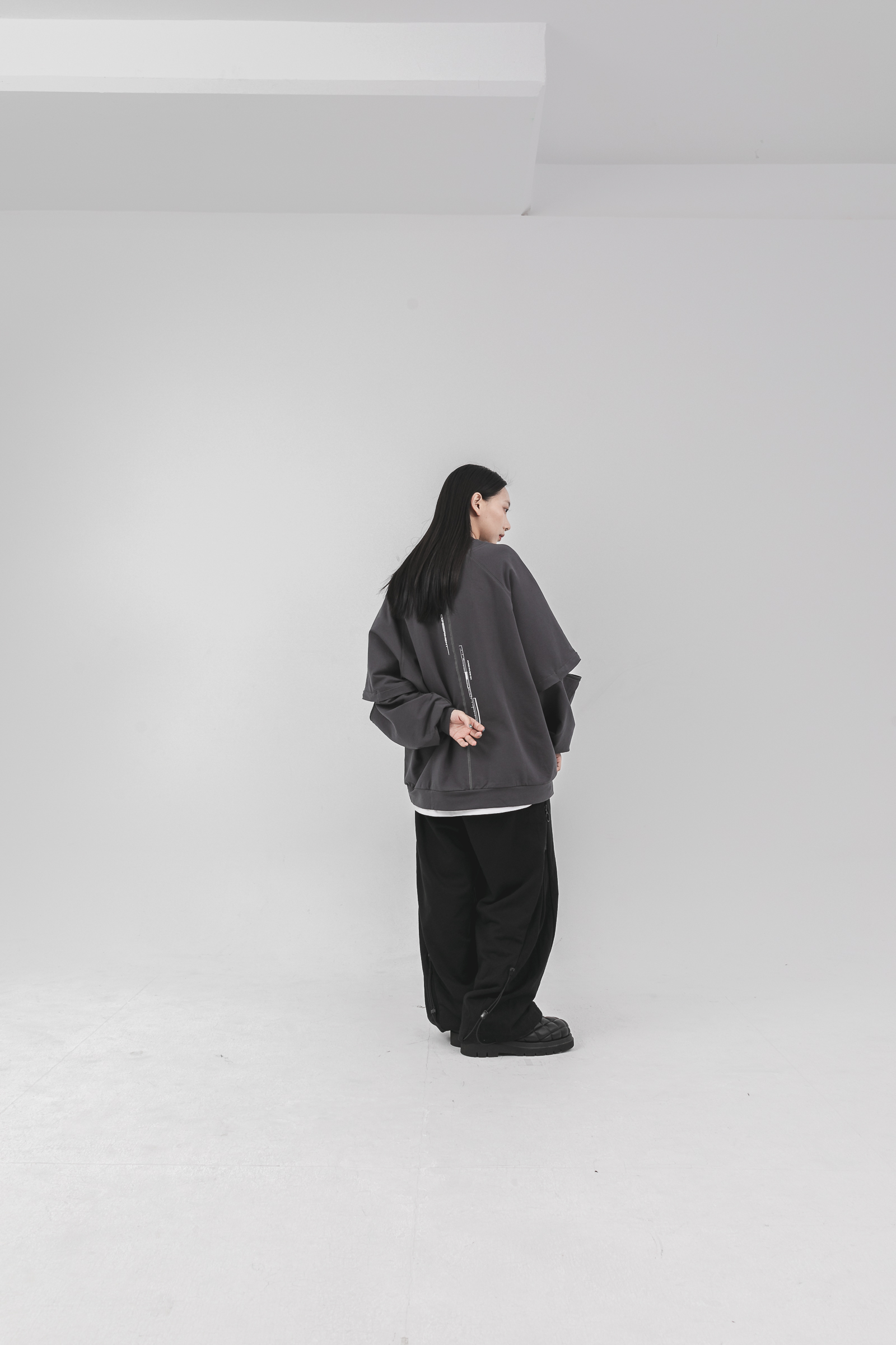 本次作品採用100%Cotton透氣舒適魚鱗棉布,規律環繞狀織紋具備舒適穿著感受與柔軟蓬鬆度,版型寬鬆舒適給予穿著愜意與廓形理想條件,腰圍處配置褲耳設計並於兩側與後側處設計雙插口袋,供著用者平行調整與置物收納需求;”KP-02”以兩側調節拉鍊與褲管抽繩設計作為「延異」的主體呈現,廓形版型與收縮版型可隨穿搭層次逐一調節與適性定義,採用魚鱗棉布翻接型塑類異材質拼接增加單品層次,最後於左側褲管以SATIVASTUDIO LOGO字樣點綴系列推演之義,穿著定義由自己決定。