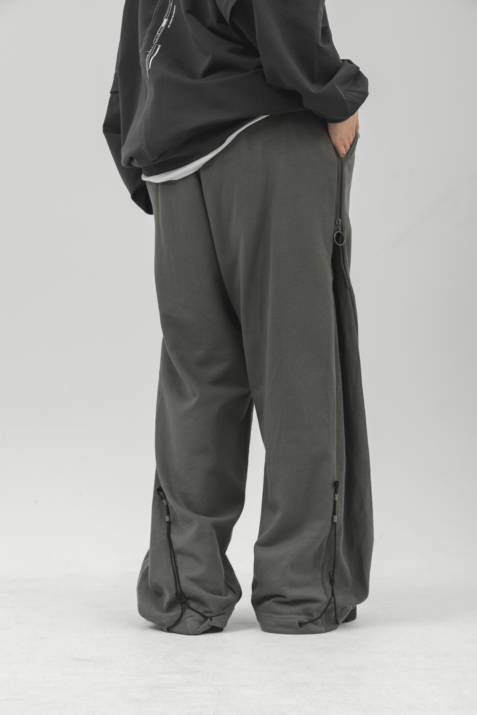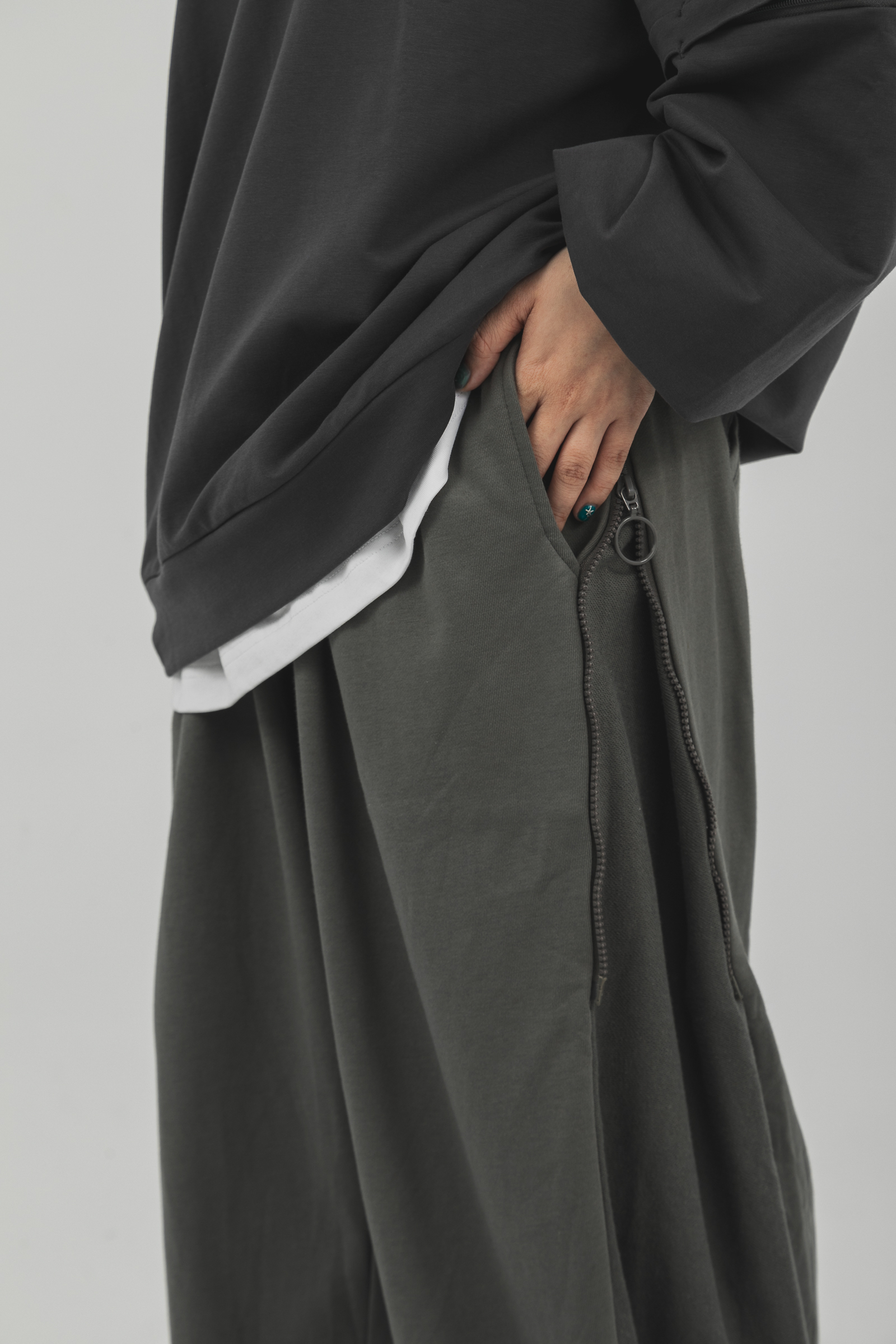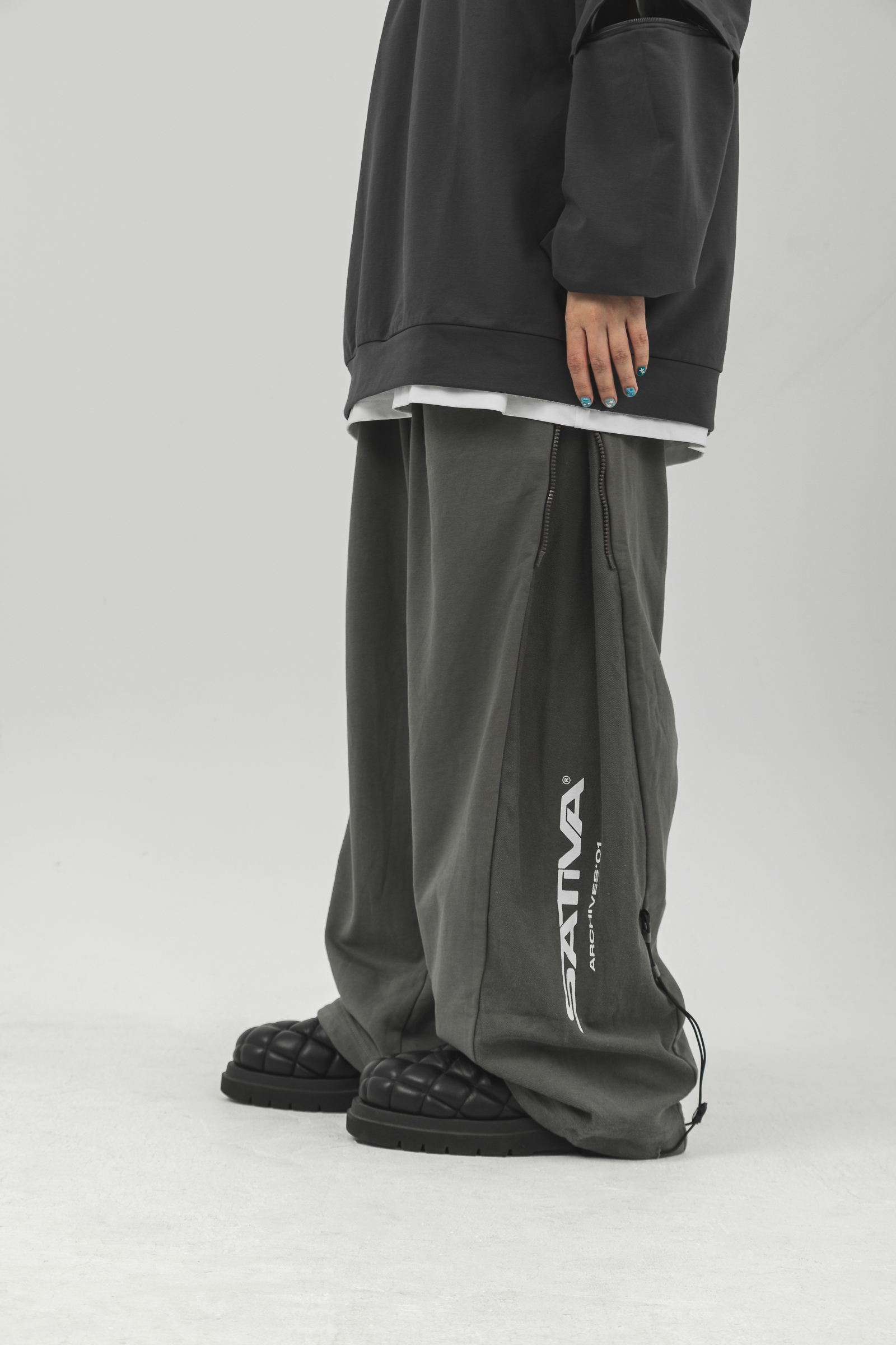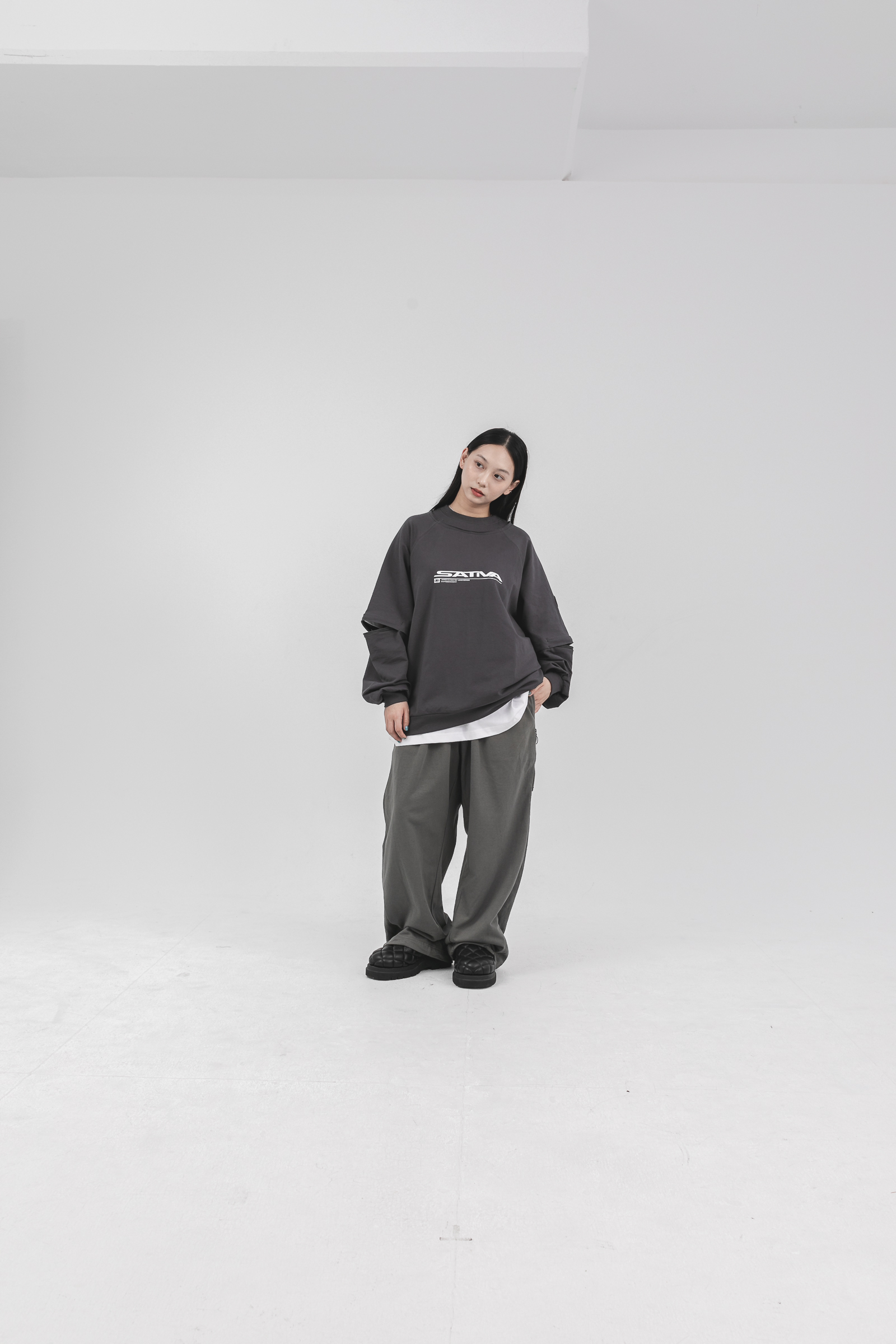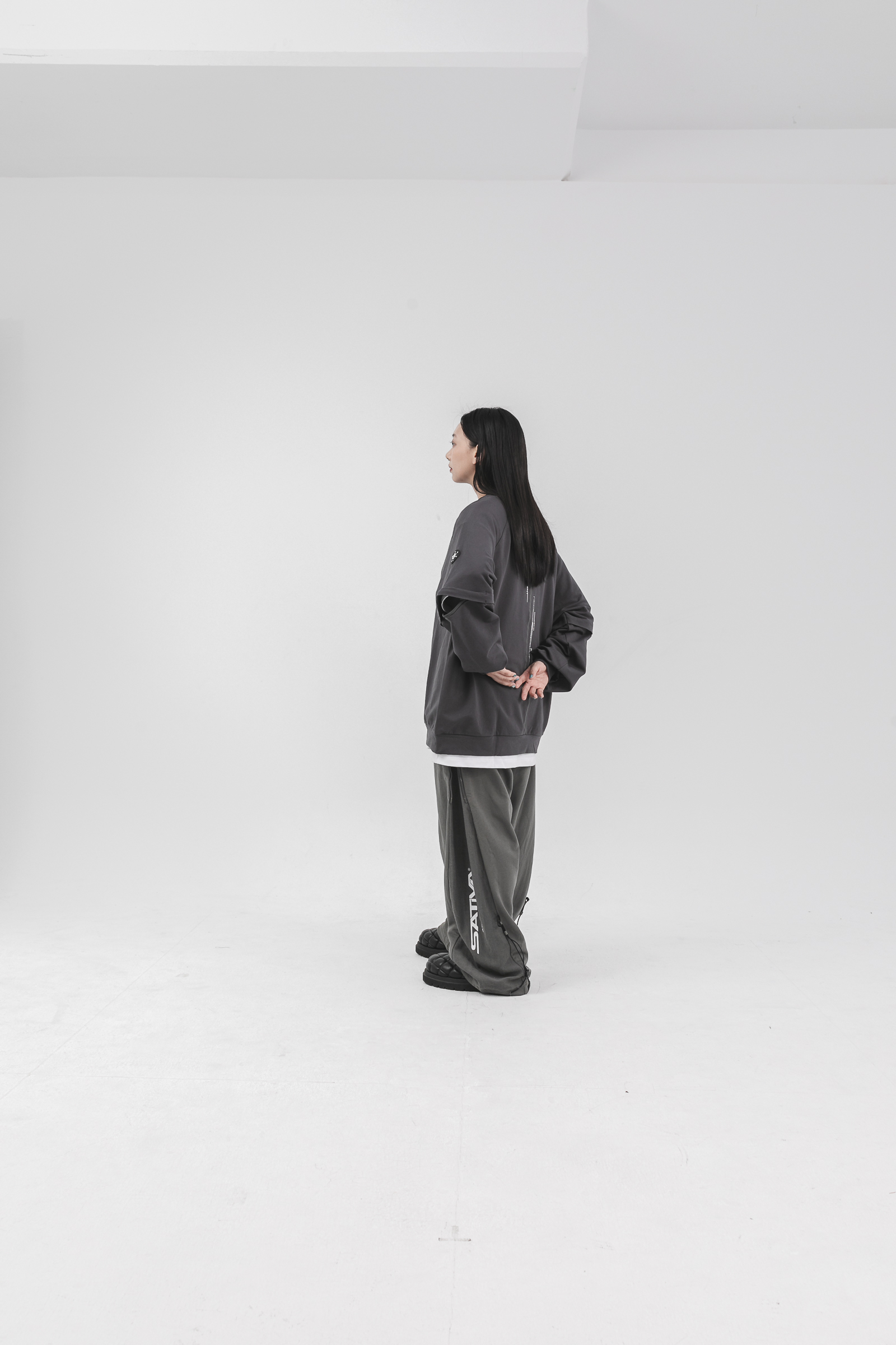 本次作品採用100%Cotton透氣舒適魚鱗棉布,規律環繞狀織紋具備舒適穿著感受與柔軟蓬鬆度,版型寬鬆舒適給予穿著愜意與廓形理想條件,腰圍處配置褲耳設計並於兩側與後側處設計雙插口袋,供著用者平行調整與置物收納需求;”KP-02”以兩側調節拉鍊與褲管抽繩設計作為「延異」的主體呈現,廓形版型與收縮版型可隨穿搭層次逐一調節與適性定義,採用魚鱗棉布翻接型塑類異材質拼接增加單品層次,最後於左側褲管以SATIVASTUDIO LOGO字樣點綴系列推演之義,穿著定義由自己決定。