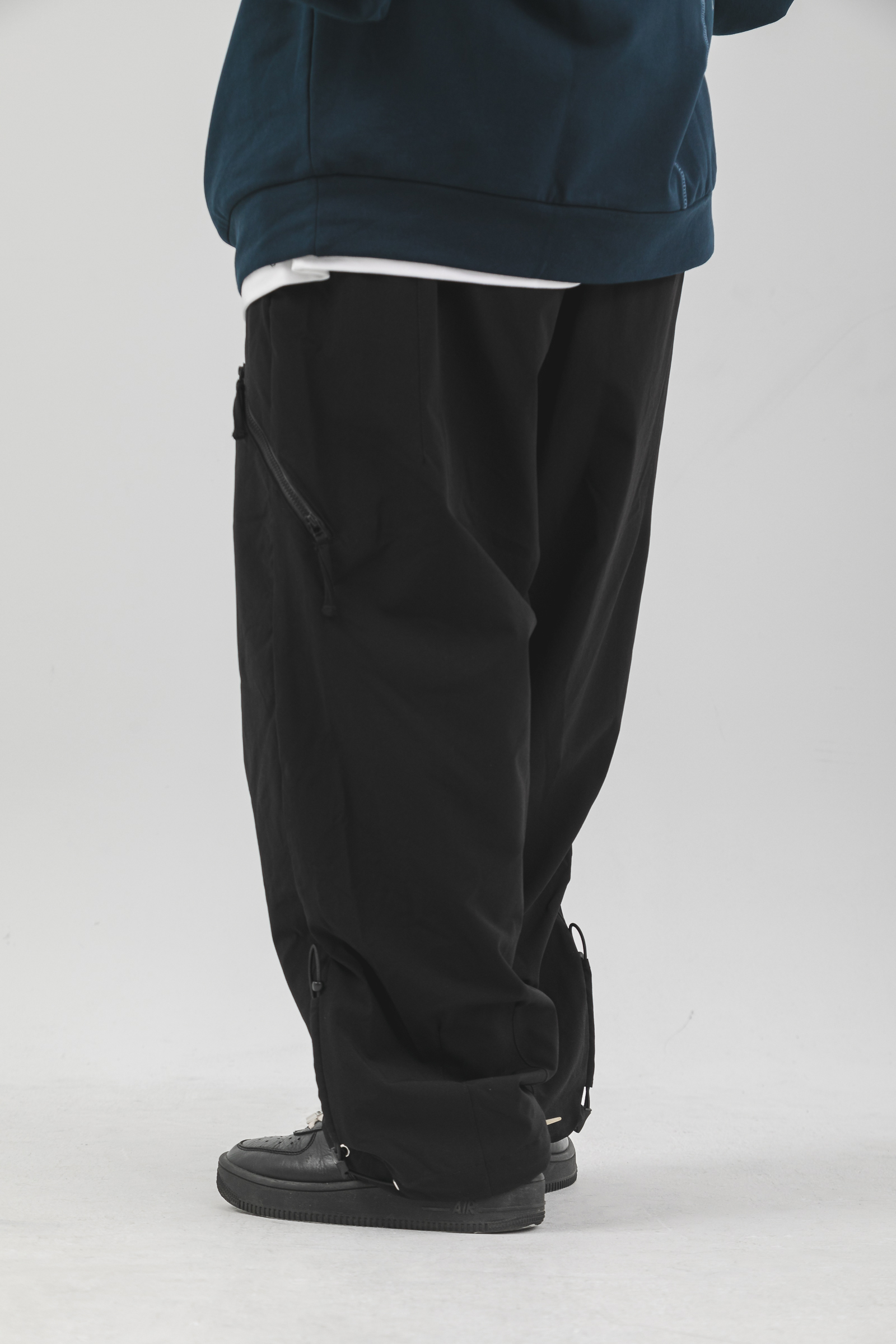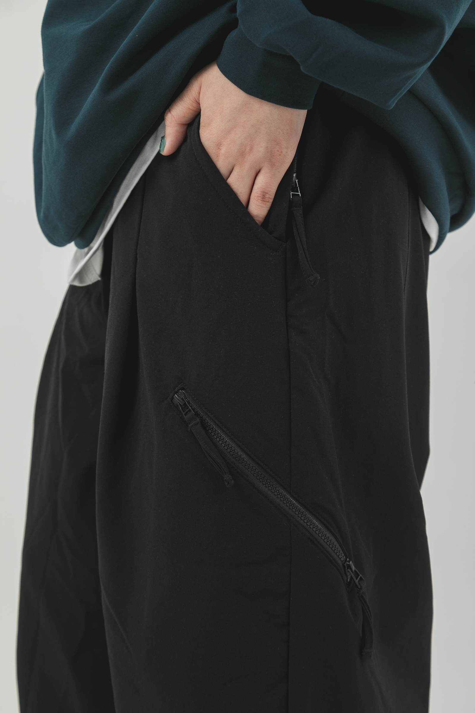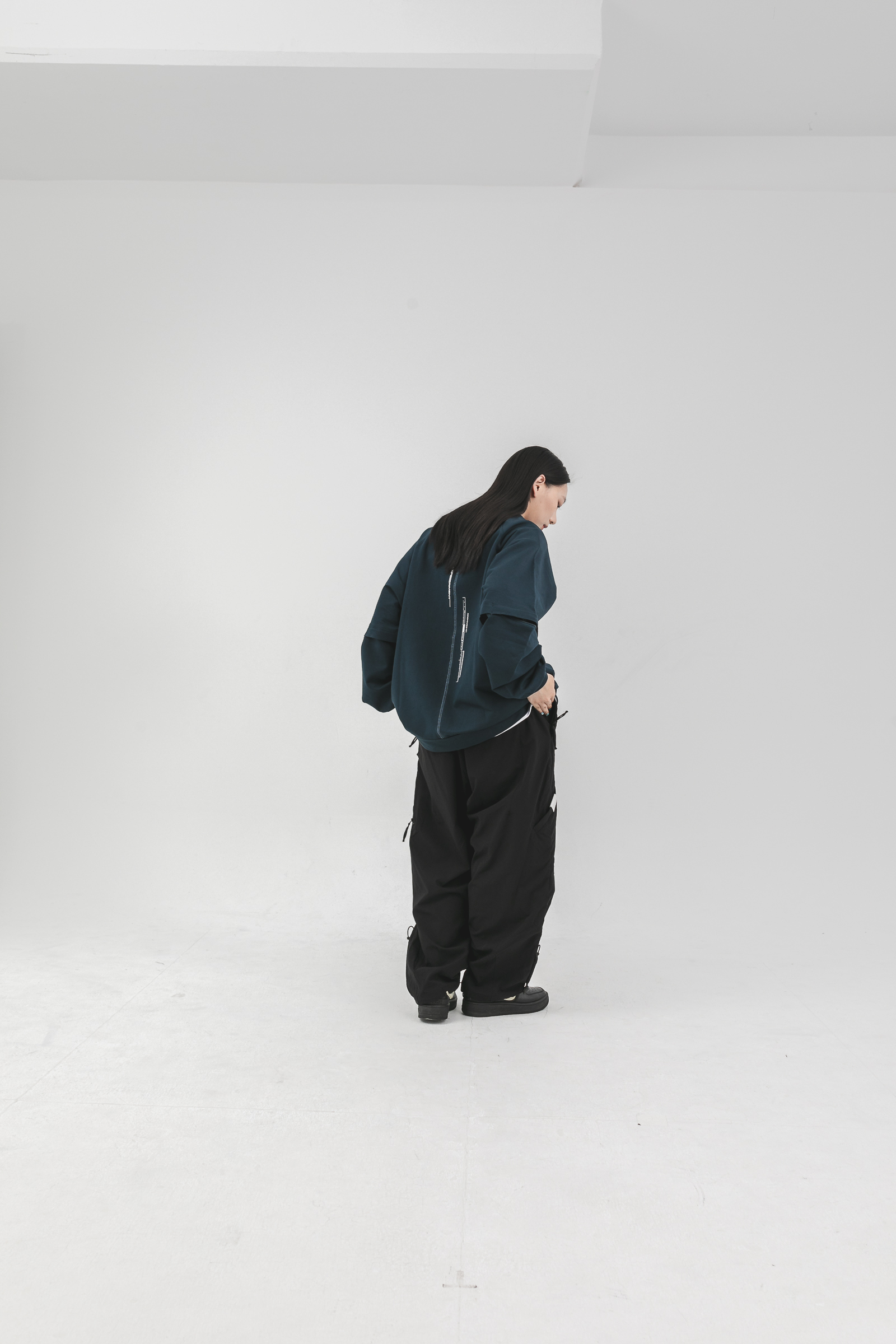 本次作品採用90% NYLON輕薄防潑水面料與10%SP彈性纖維,以”ML-01”面料為基礎升級,提升整體褲體寬鬆版型與穿著張力;腰圍褲耳設計輔以塑片D環,任穿著者隨意配置與個性化調整;雙手雙層拉鍊口袋設計給予穿著者適應各種情況的收納需求,右側褲管插袋延續褲管本身,並配置SATIVASTUDIO麂皮標點綴,累積整體機能的交互作用與提升功能視覺效果;左側褲管則配以雙開拉鍊疊加單品層次與穿搭邏輯,最後於褲管處新增抽繩與折線設計,以因應各種場域的穿搭湧現與營造日常著用的儀式感需求,複雜系統中自行組織,並產生各種新奇結構與組合。