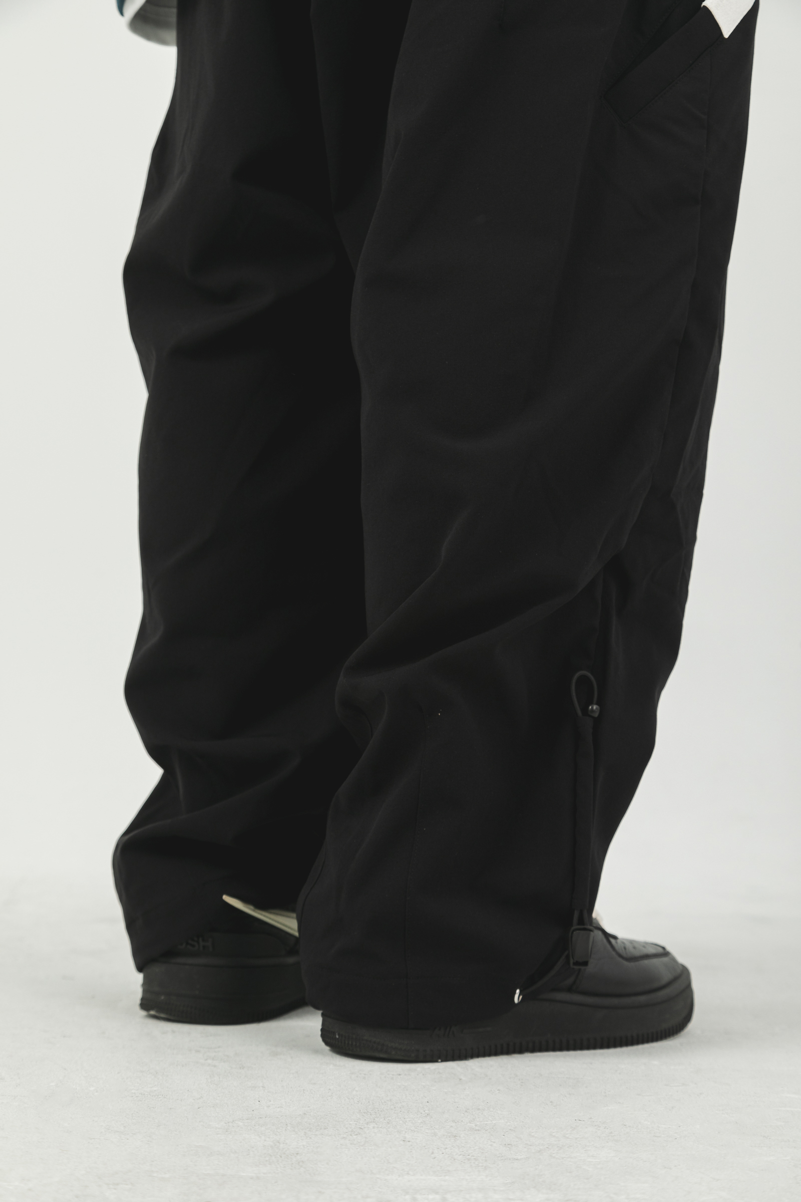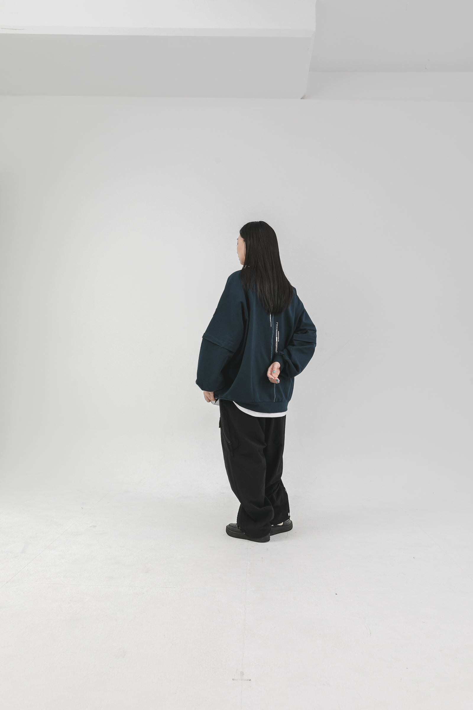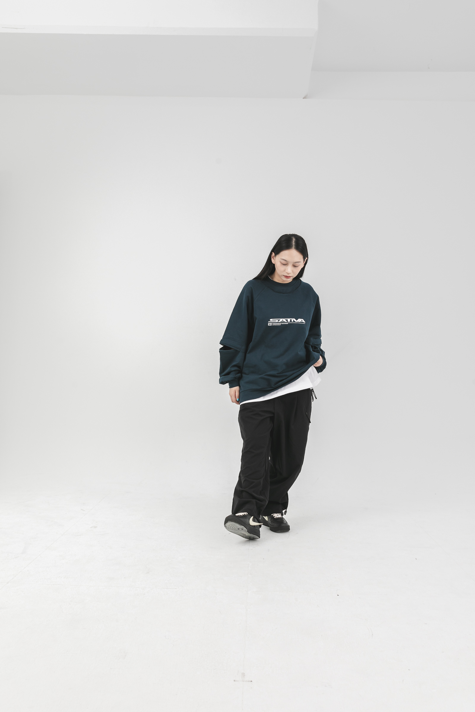 本次作品採用90% NYLON輕薄防潑水面料與10%SP彈性纖維,以”ML-01”面料為基礎升級,提升整體褲體寬鬆版型與穿著張力;腰圍褲耳設計輔以塑片D環,任穿著者隨意配置與個性化調整;雙手雙層拉鍊口袋設計給予穿著者適應各種情況的收納需求,右側褲管插袋延續褲管本身,並配置SATIVASTUDIO麂皮標點綴,累積整體機能的交互作用與提升功能視覺效果;左側褲管則配以雙開拉鍊疊加單品層次與穿搭邏輯,最後於褲管處新增抽繩與折線設計,以因應各種場域的穿搭湧現與營造日常著用的儀式感需求,複雜系統中自行組織,並產生各種新奇結構與組合。