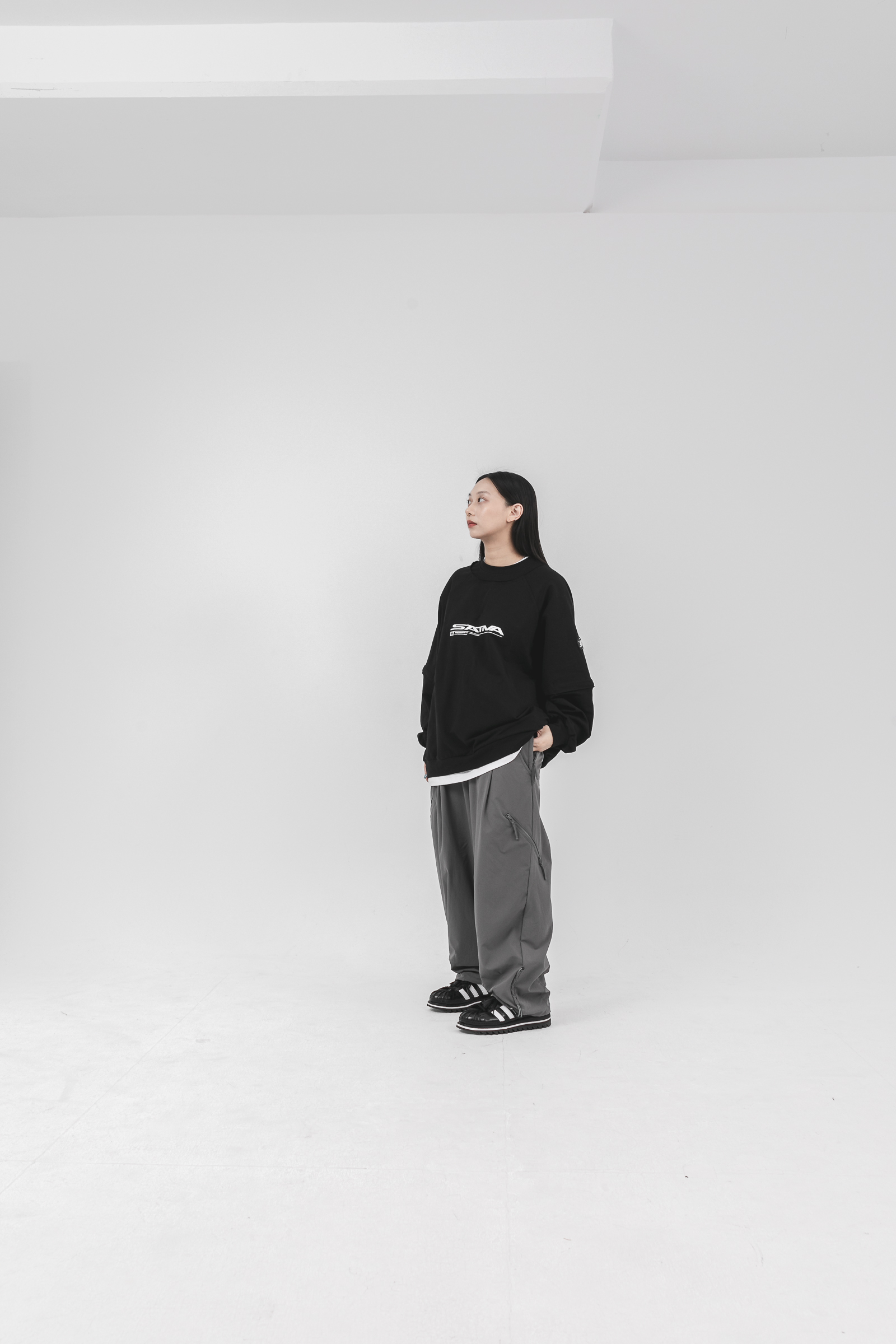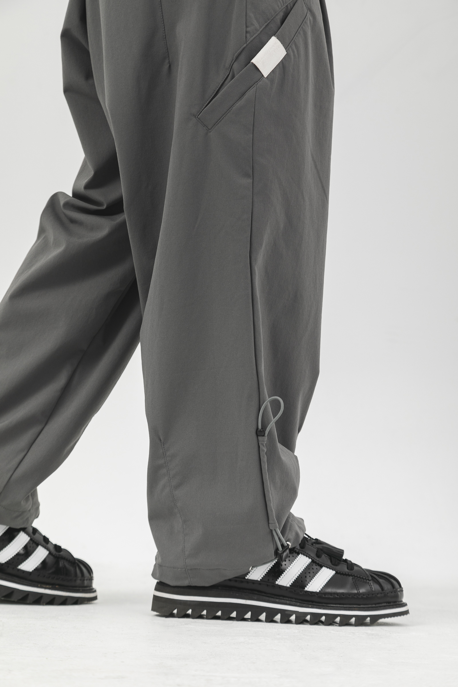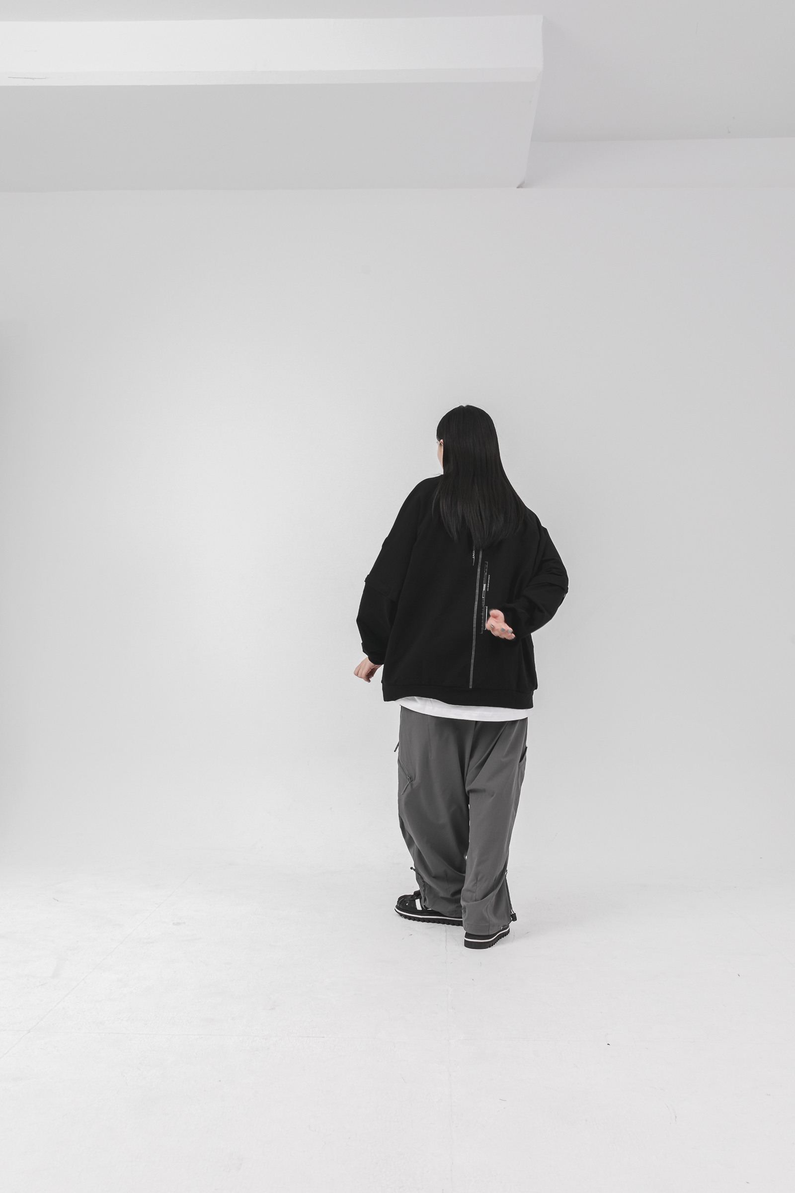 本次作品採用90% NYLON輕薄防潑水面料與10%SP彈性纖維,以”ML-01”面料為基礎升級,提升整體褲體寬鬆版型與穿著張力;腰圍褲耳設計輔以塑片D環,任穿著者隨意配置與個性化調整;雙手雙層拉鍊口袋設計給予穿著者適應各種情況的收納需求,右側褲管插袋延續褲管本身,並配置SATIVASTUDIO麂皮標點綴,累積整體機能的交互作用與提升功能視覺效果;左側褲管則配以雙開拉鍊疊加單品層次與穿搭邏輯,最後於褲管處新增抽繩與折線設計,以因應各種場域的穿搭湧現與營造日常著用的儀式感需求,複雜系統中自行組織,並產生各種新奇結構與組合。
