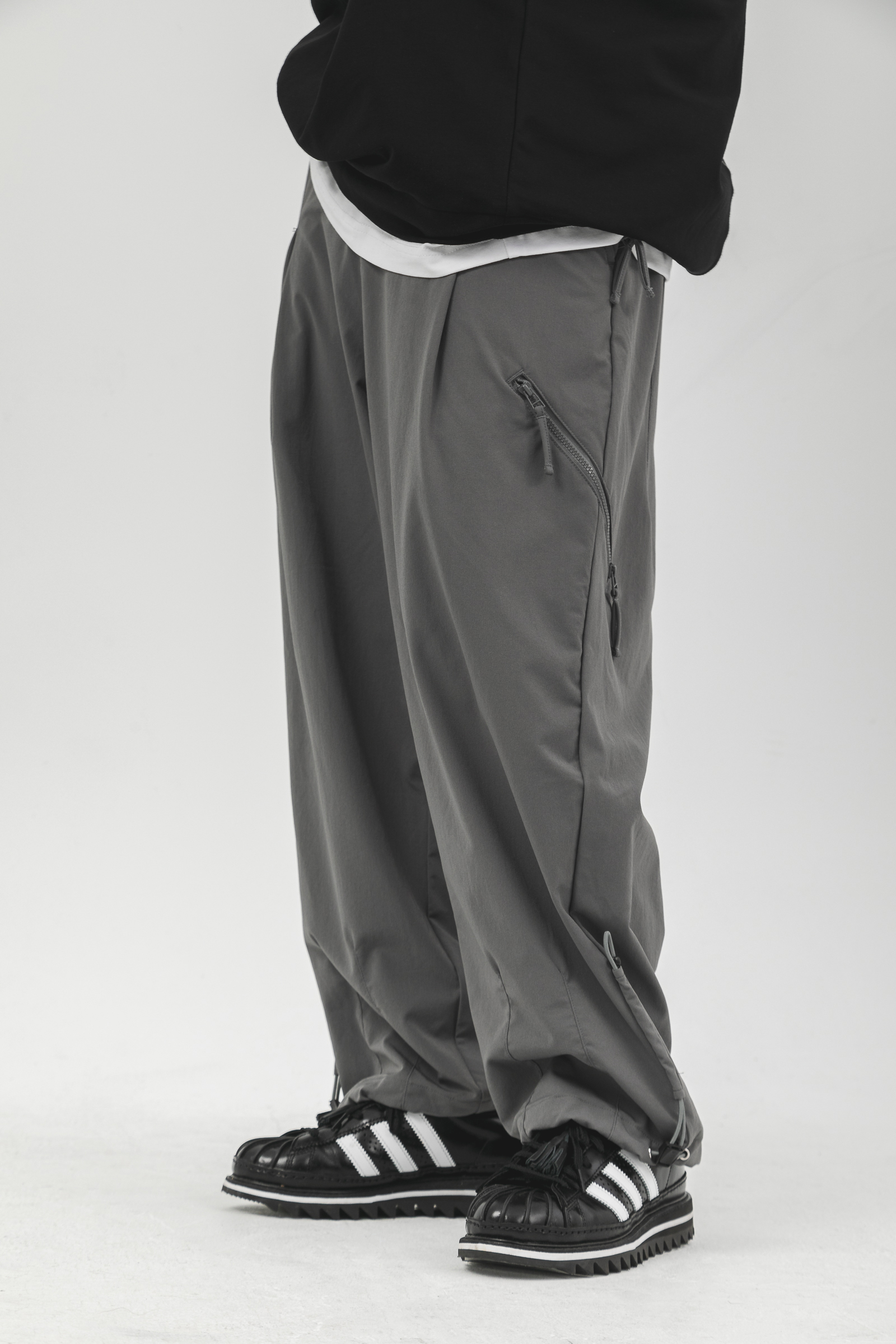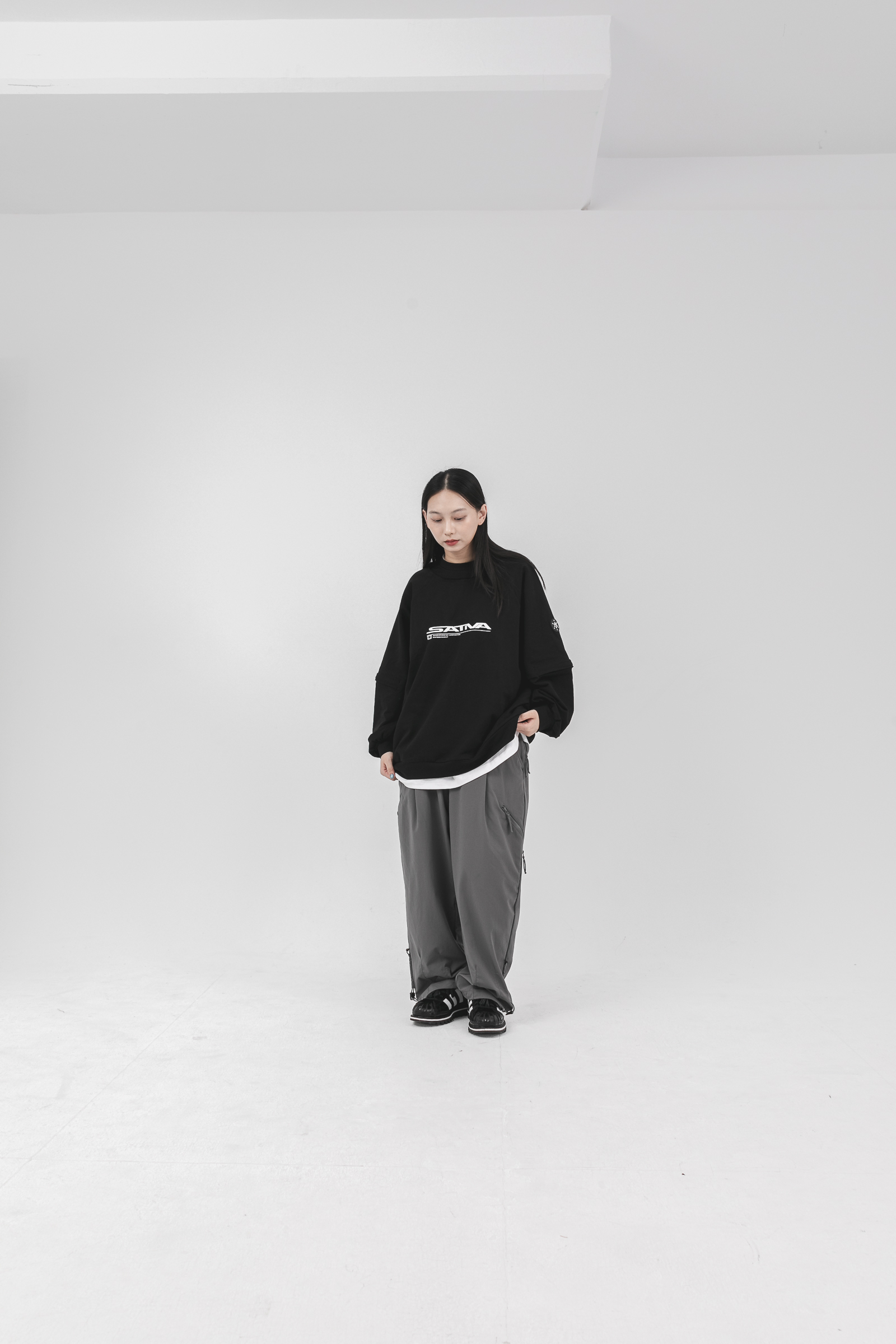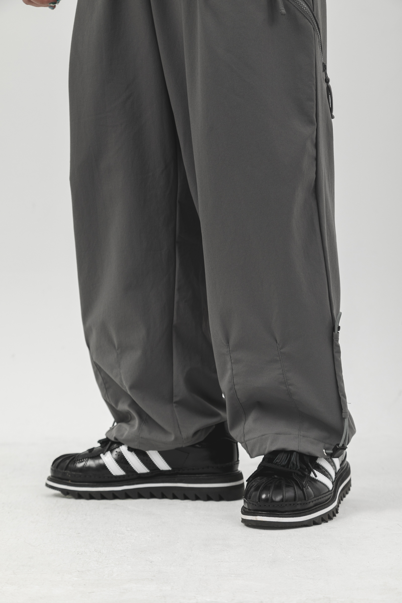 本次作品採用90% NYLON輕薄防潑水面料與10%SP彈性纖維,以”ML-01”面料為基礎升級,提升整體褲體寬鬆版型與穿著張力;腰圍褲耳設計輔以塑片D環,任穿著者隨意配置與個性化調整;雙手雙層拉鍊口袋設計給予穿著者適應各種情況的收納需求,右側褲管插袋延續褲管本身,並配置SATIVASTUDIO麂皮標點綴,累積整體機能的交互作用與提升功能視覺效果;左側褲管則配以雙開拉鍊疊加單品層次與穿搭邏輯,最後於褲管處新增抽繩與折線設計,以因應各種場域的穿搭湧現與營造日常著用的儀式感需求,複雜系統中自行組織,並產生各種新奇結構與組合。