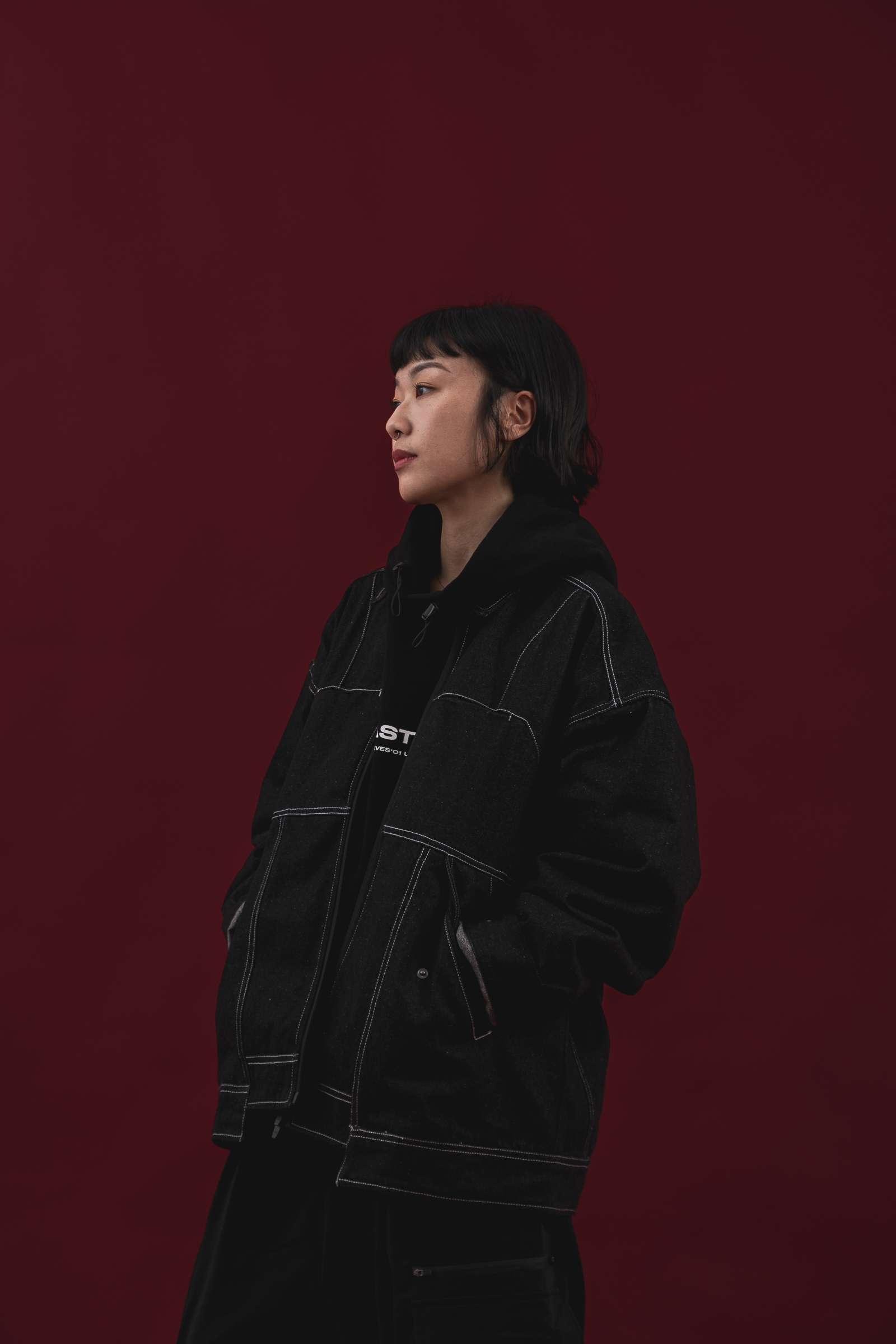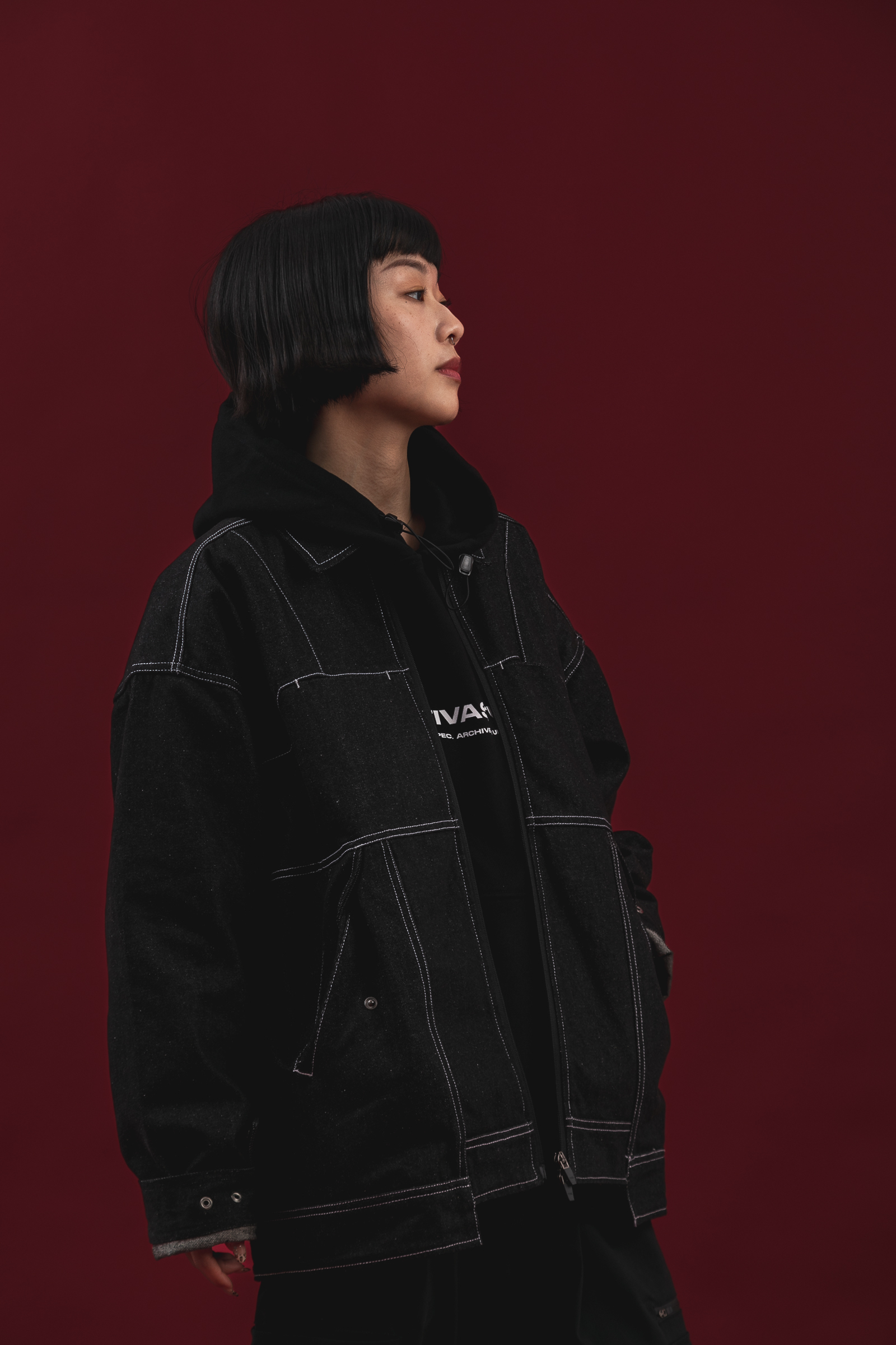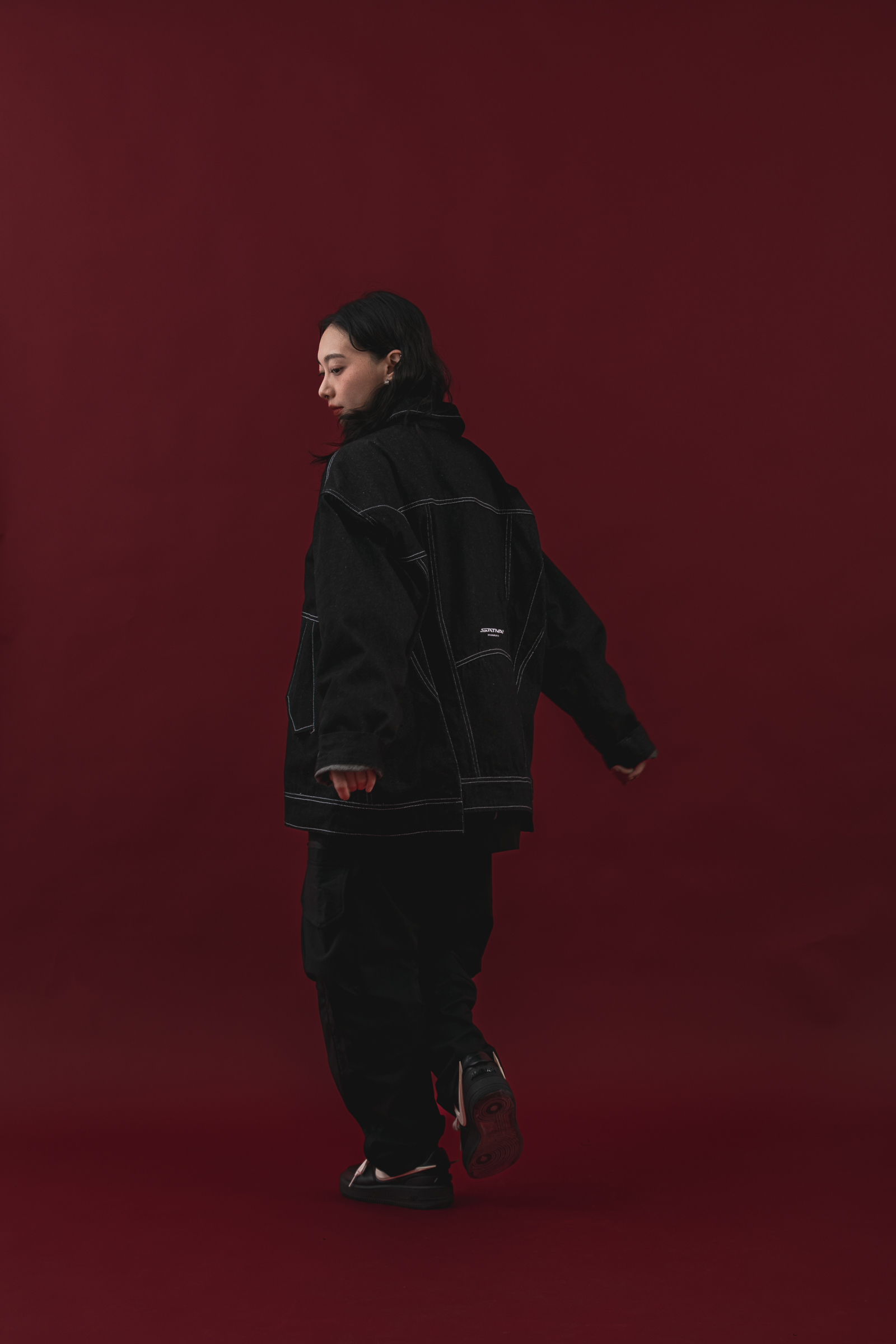 本次作品採100%Denim Fabric 黑色織精面棉布面料,保有棉質面料的舒適透氣,同時涵括丹寧的質地與硬挺塑形,整體版型構成採用多層次拼接設計,以白色單車縫線表大拼接塊的疊加;雙車縫線則勾勒細節處拼接的邏輯與流暢性,下擺處則捨棄傳統一體成型的調整釘扣設計,以鋸型層次拼接並輔以品牌麂皮標點綴,色調、剪裁與穿著適性三位一體;前胸雙層口袋與雙手釘扣口袋給予穿著者置物與收納便利考量,對於23AW季末款式,我們期許“S.TV-X2”能帶來不同的想像,對日常的想像。