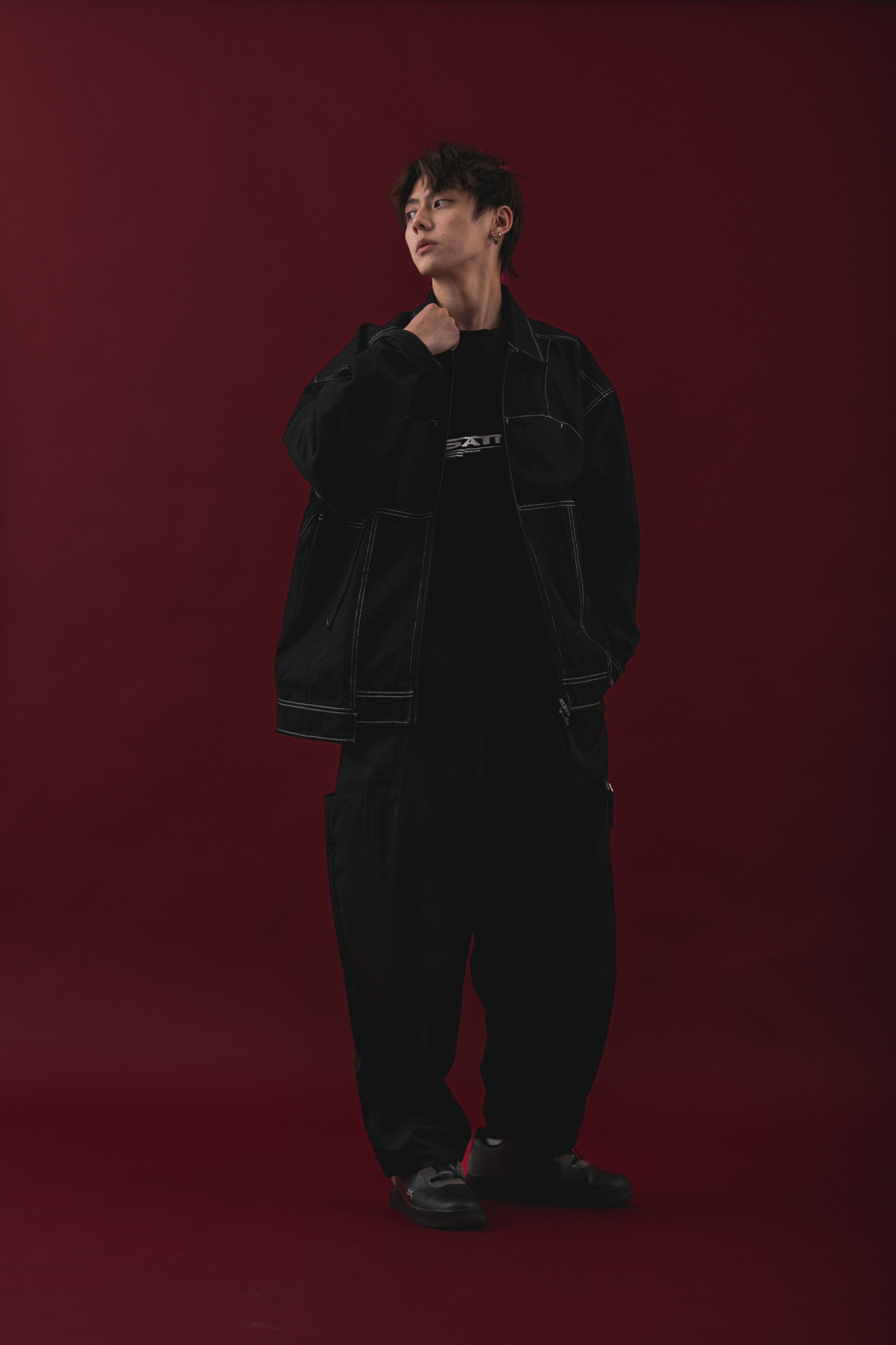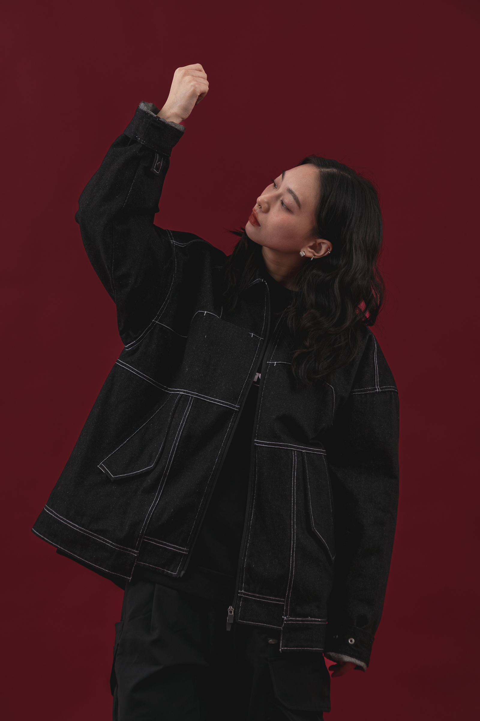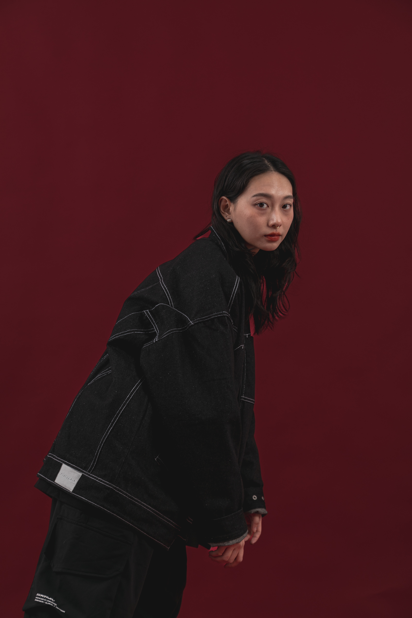 本次作品採100%Denim Fabric 黑色織精面棉布面料,保有棉質面料的舒適透氣,同時涵括丹寧的質地與硬挺塑形,整體版型構成採用多層次拼接設計,以白色單車縫線表大拼接塊的疊加;雙車縫線則勾勒細節處拼接的邏輯與流暢性,下擺處則捨棄傳統一體成型的調整釘扣設計,以鋸型層次拼接並輔以品牌麂皮標點綴,色調、剪裁與穿著適性三位一體;前胸雙層口袋與雙手釘扣口袋給予穿著者置物與收納便利考量,對於23AW季末款式,我們期許“S.TV-X2”能帶來不同的想像,對日常的想像。