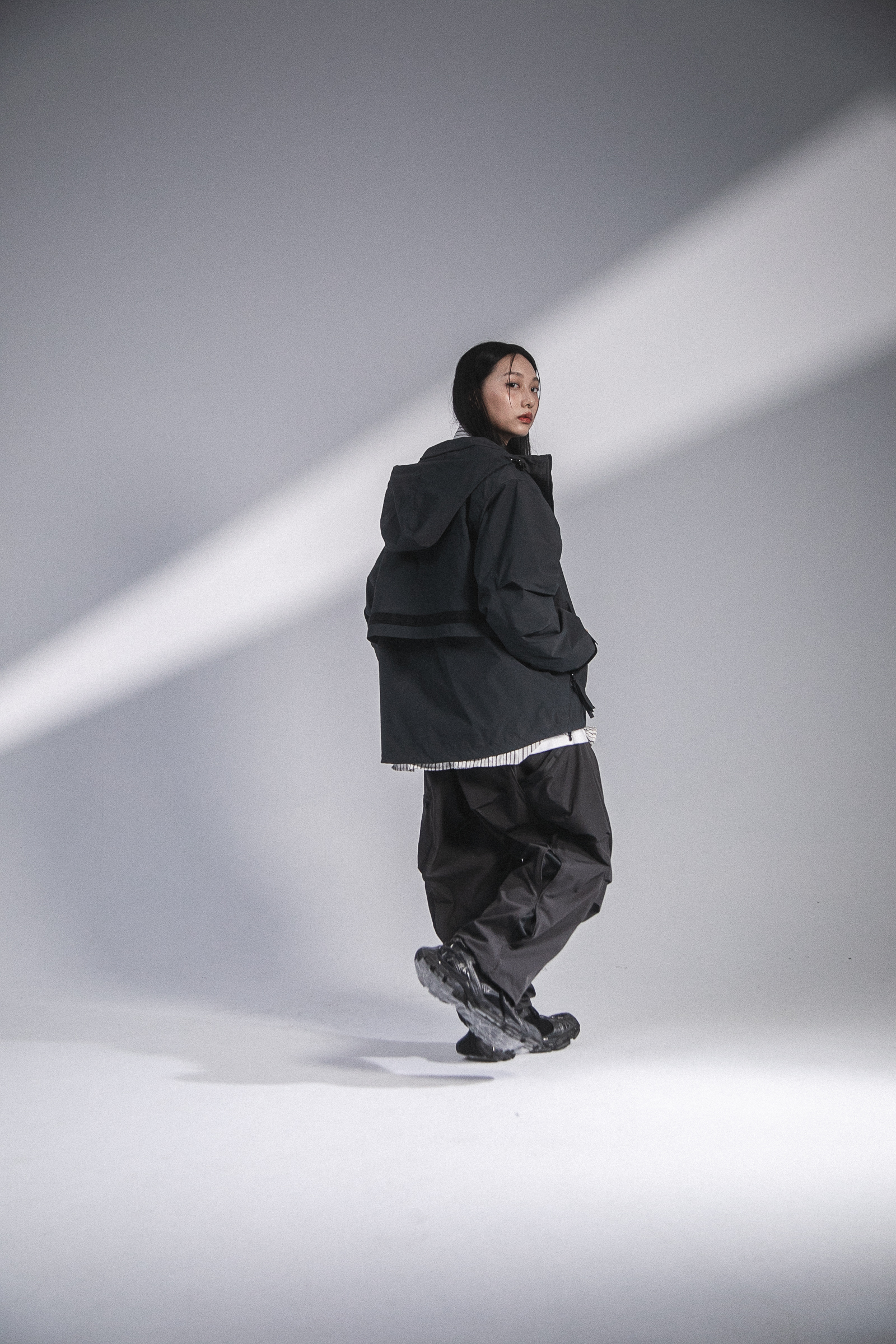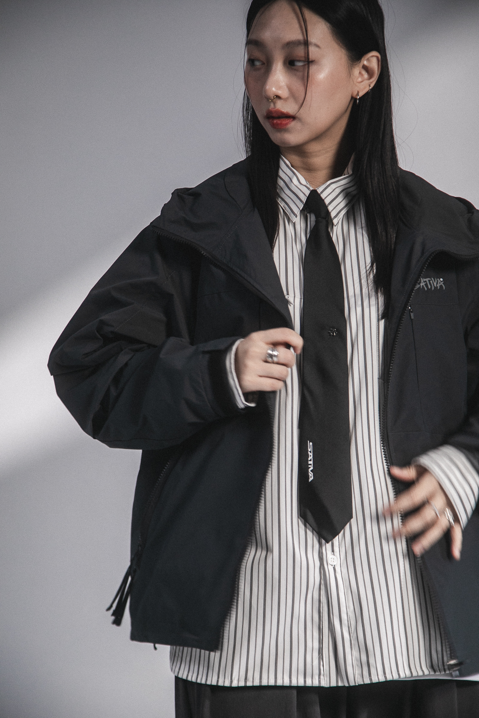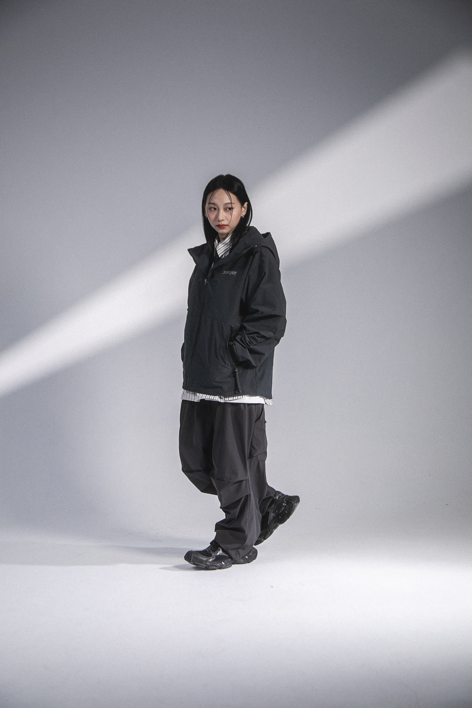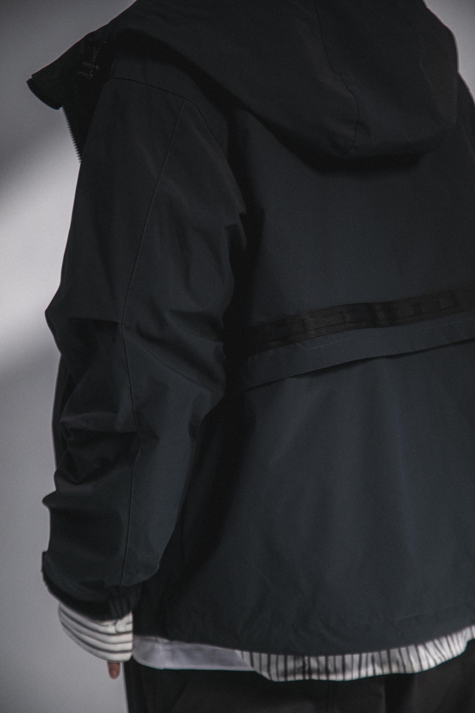 本次作品採用100% Nylon面料,內裏配置舒適親膚材質給予裡外應和的穿著體驗,前側設計蘊含多元都市風格與建構生活方式必備的單品規格,帽領融入衣領立領概念,襯托衣帽本體的立體特性與注入活性,左胸反光LOGO搭配兩側隱藏式彈片口袋,賦予多層次穿搭之上的無限可能;手袖剪裁運用活折設計搭配袖口魔鬼沾調節,以順應任何場域的束裝需求;兩側口袋拉鍊給予穿著者收納隨物的應用空間與廣泛用途,並於下擺處配置螢光抽繩呼應主體設計;後背處延續“S.TV-X”系列設計草擬,雙層剪裁輔以雙層織帶,在一片簡樸單品上羅列更多穿搭邏輯,融入都市並鏡射自我。