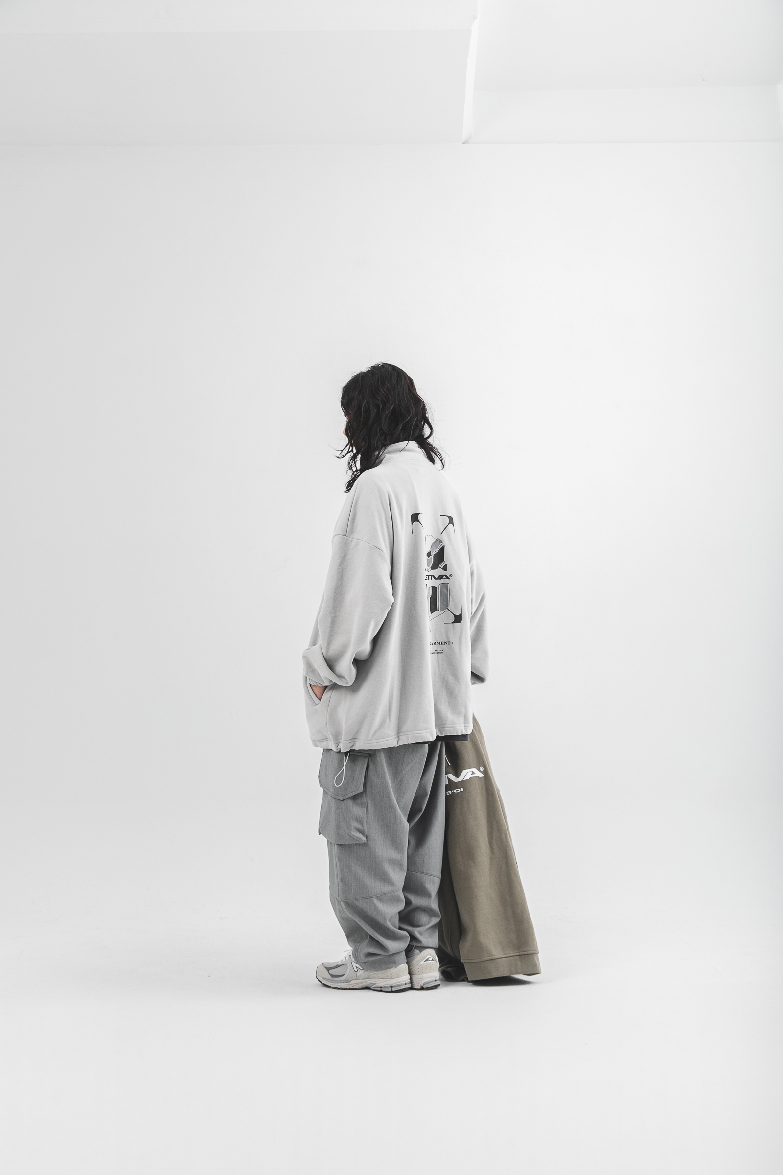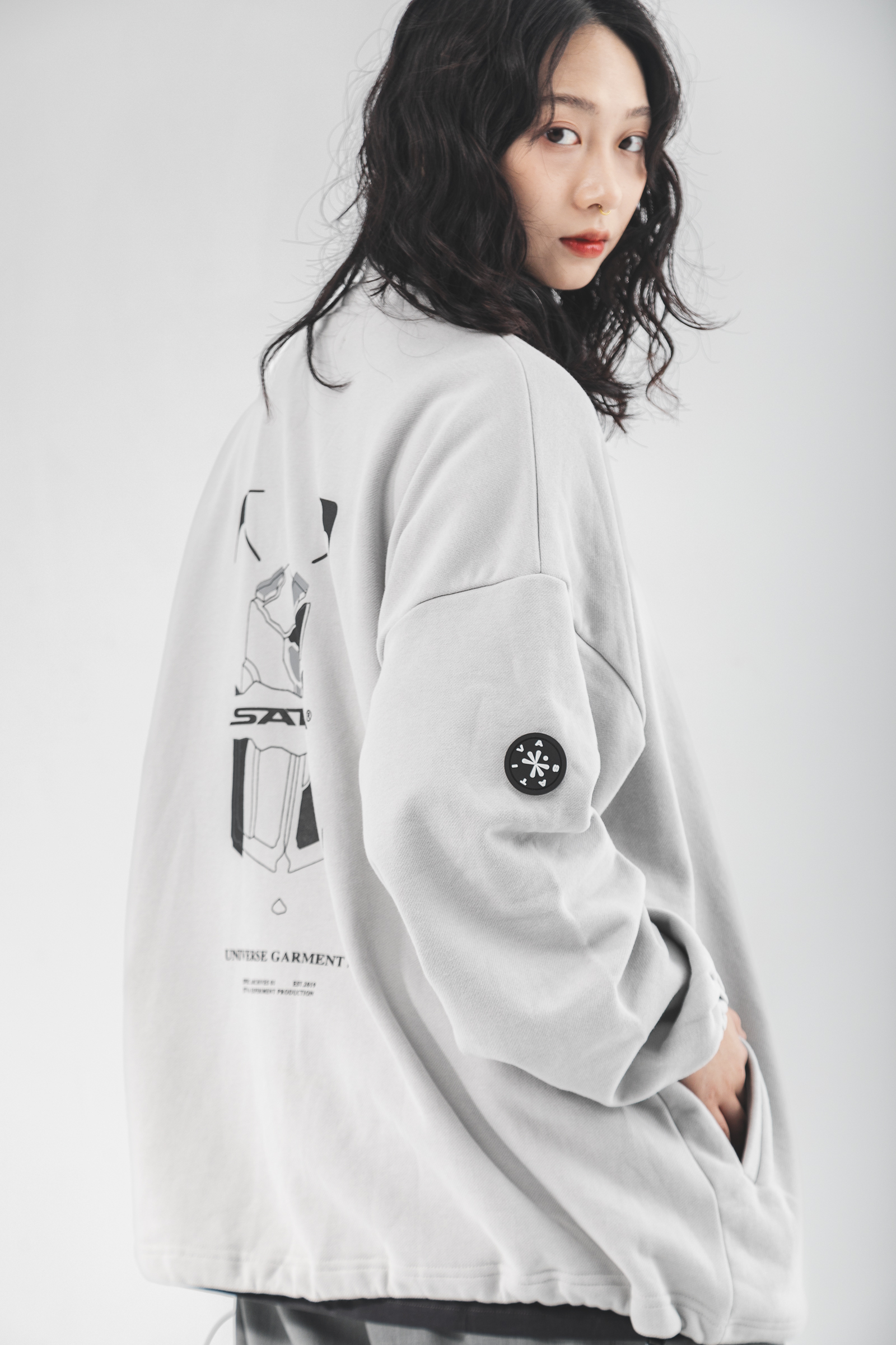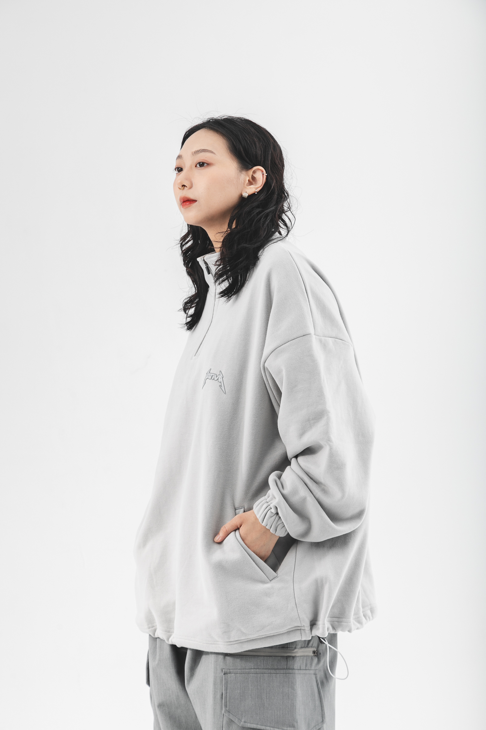 本次作品採純棉魚鱗內絨毛,質地柔軟輕膚的同時保有透氣舒適性,給予12月應有的穿著考量與需求,並以整體寬鬆版型剪裁,適用於任意體態,拉鍊式立領設計結合雙手插袋賦予單著與外搭的任一著用,得以應付任何場域與情境;袖口鬆緊帶與下襬鬆緊抽繩呼應作為實驗性單品的想像,可隨意調節不受拘束;左胸處採用品牌凸版印刷以及右袖品牌膠標,點綴素面立體形象,為其添增穿搭邏輯與層次,最後於背身融合本次品牌主視覺與Tagline,勾勒出品牌意象與所傳遞的訊息。
