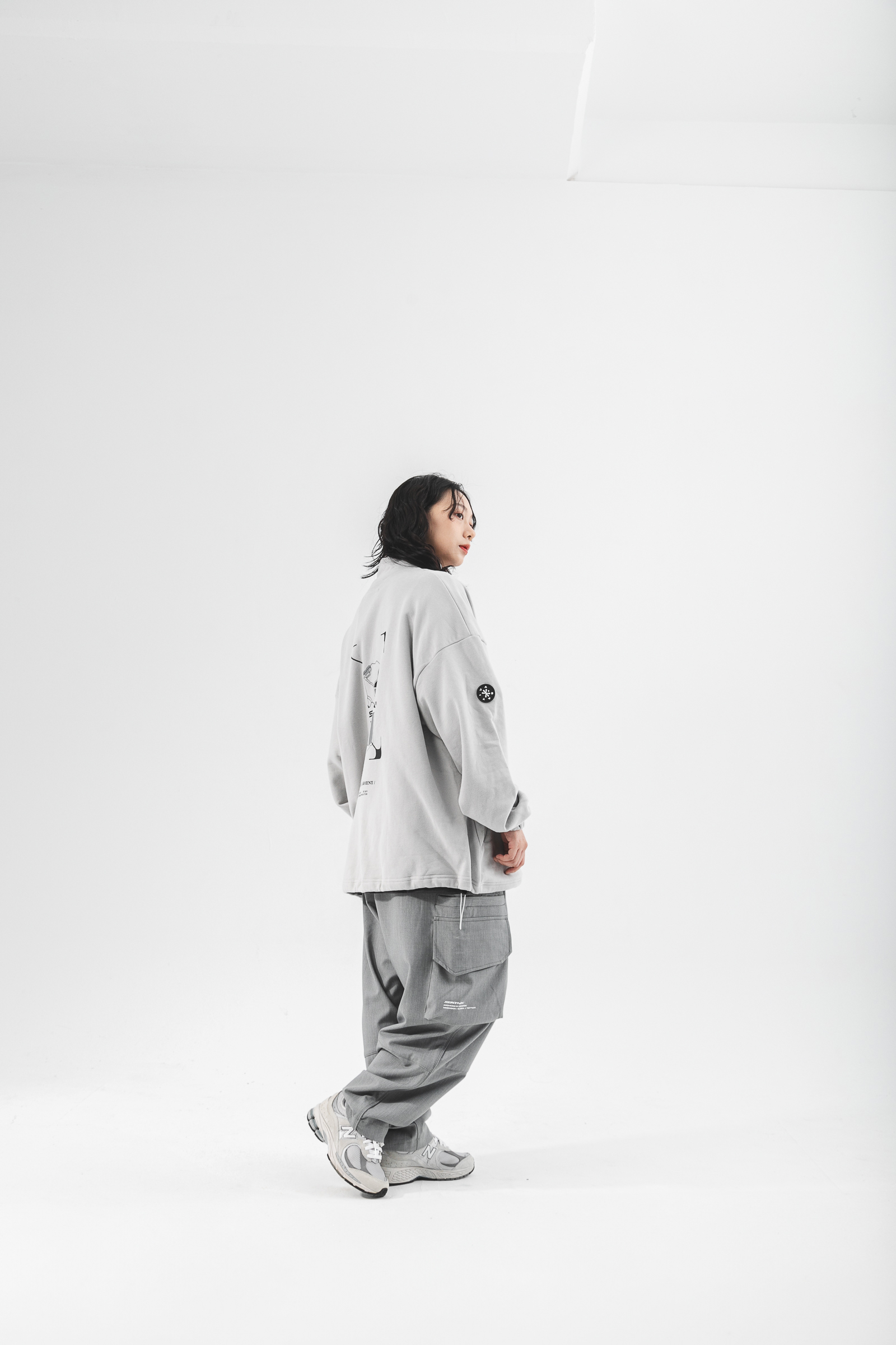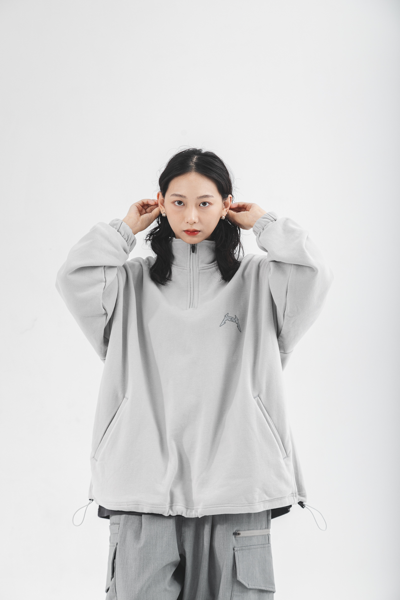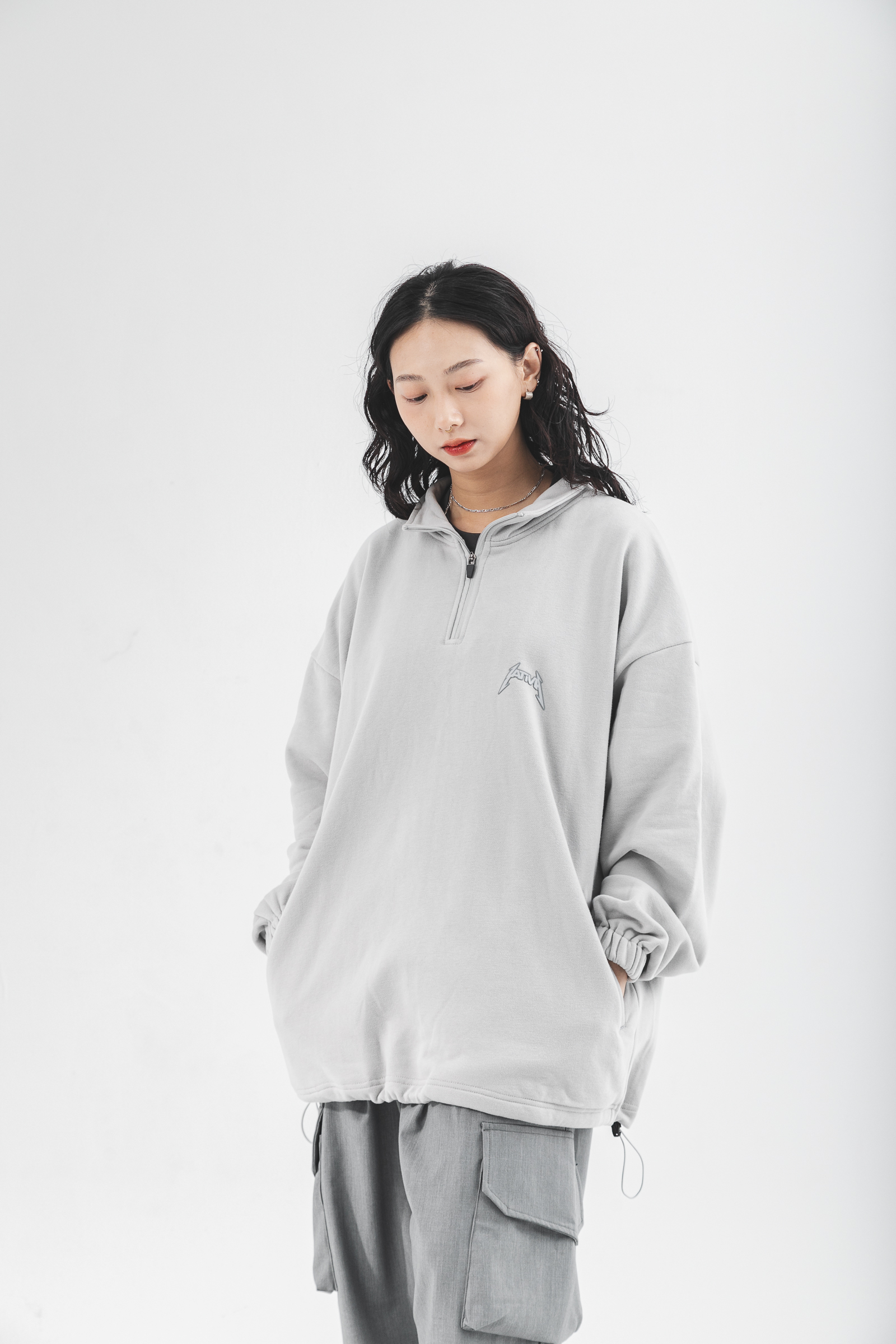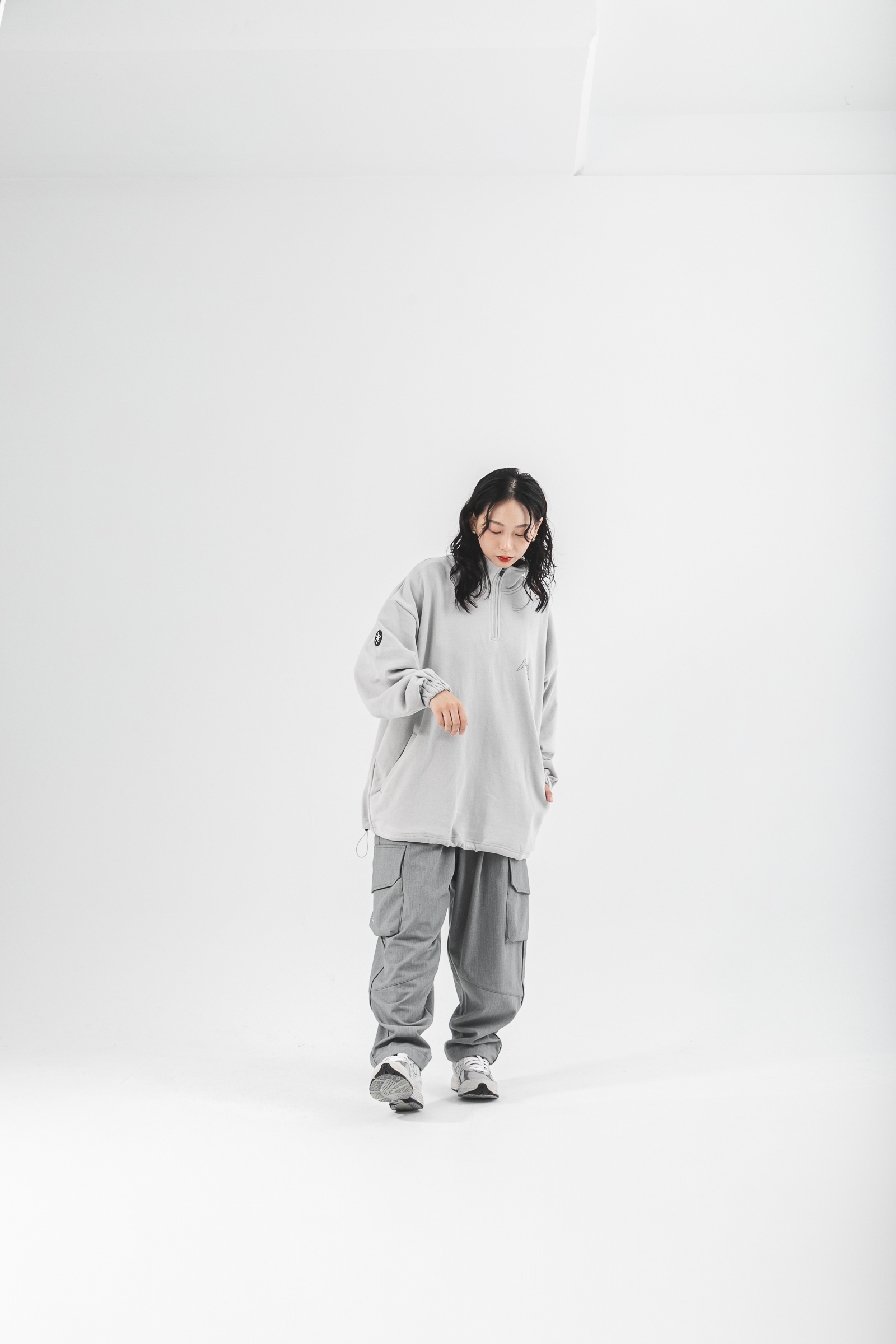 本次作品採純棉魚鱗內絨毛,質地柔軟輕膚的同時保有透氣舒適性,給予12月應有的穿著考量與需求,並以整體寬鬆版型剪裁,適用於任意體態,拉鍊式立領設計結合雙手插袋賦予單著與外搭的任一著用,得以應付任何場域與情境;袖口鬆緊帶與下襬鬆緊抽繩呼應作為實驗性單品的想像,可隨意調節不受拘束;左胸處採用品牌凸版印刷以及右袖品牌膠標,點綴素面立體形象,為其添增穿搭邏輯與層次,最後於背身融合本次品牌主視覺與Tagline,勾勒出品牌意象與所傳遞的訊息。