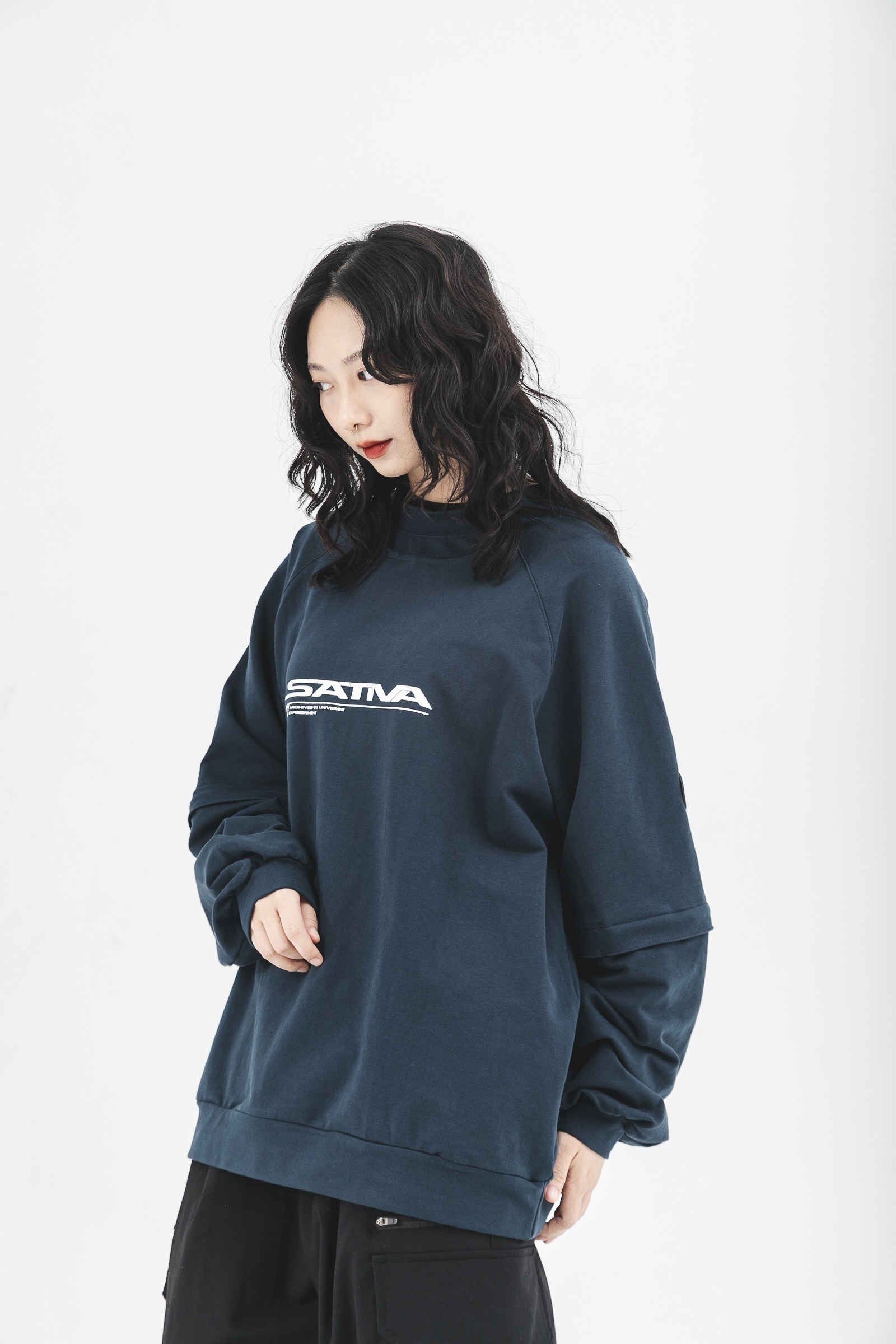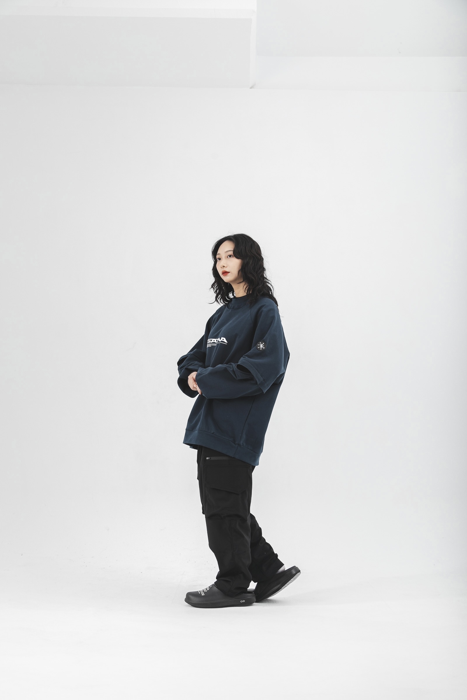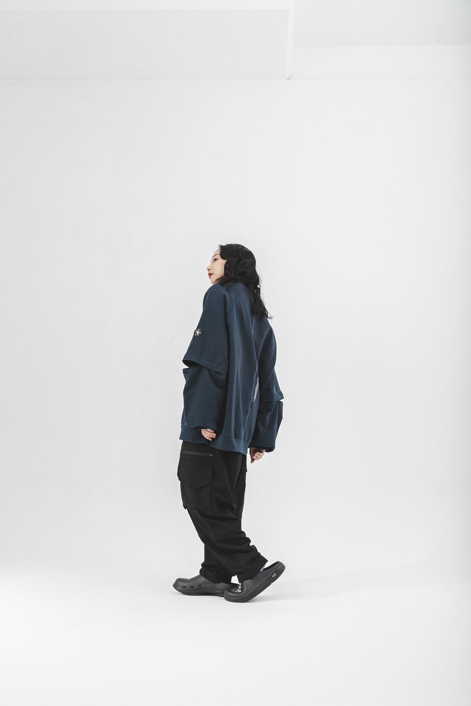 本次作品採用95% Cotton與5% SP彈性纖維,面料升級保有棉質的透氣性以及彈性棉襖的舒適感,結合圓領拼接層次不收編寬鬆版型設計,整體俐落輕盈,研擬四季皆可著用且適配任何場域的兼容並蓄;拼接剪裁採用拉克蘭袖設計,流線調節適合各種身型與體態者著用,並於兩處袖口新增拉鍊半雙開彈片設計,給予穿搭層次形塑更多層次與任何排列組合,創造屬於自己的穿著風格;衣身正面主視覺採SATIVASTUDIO LOGO,左袖以品牌膠標點綴;衣身後背採爬線拷克縫接布料本體與設計元素,附以品牌Tagline,原意實驗性單品與網頁原子時間軸,象徵原子質量的重新建構。
