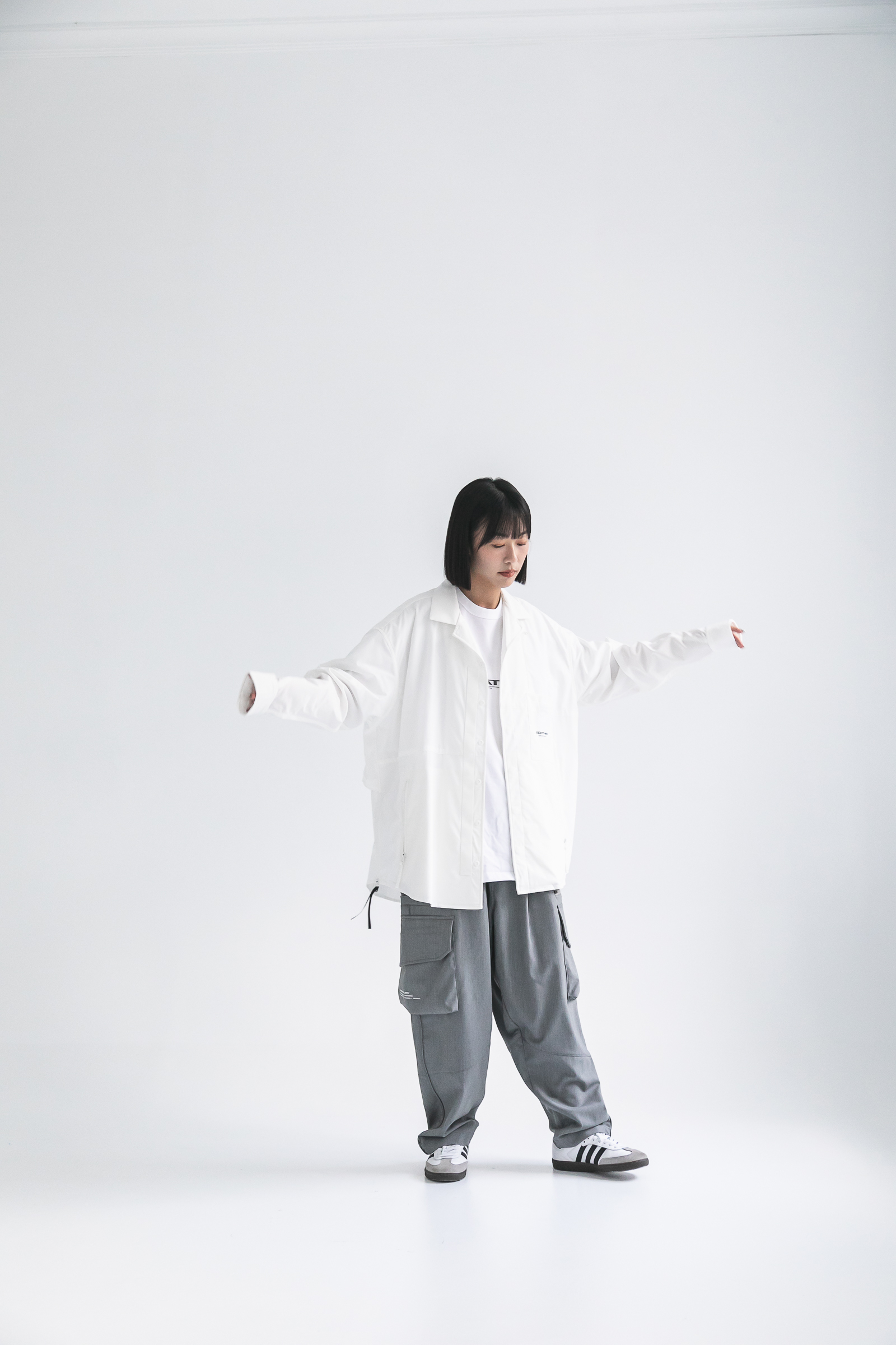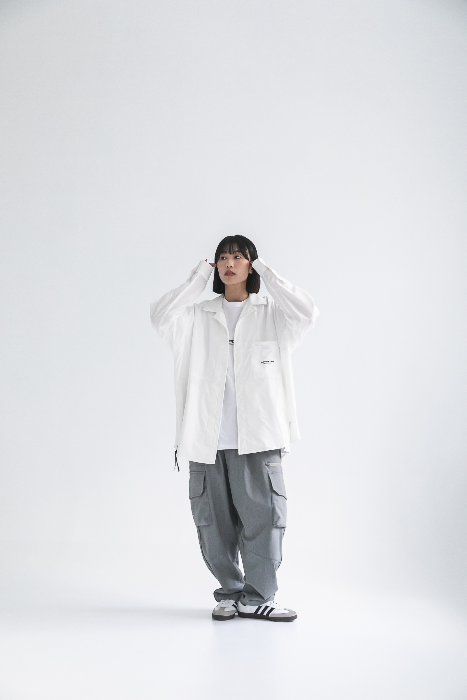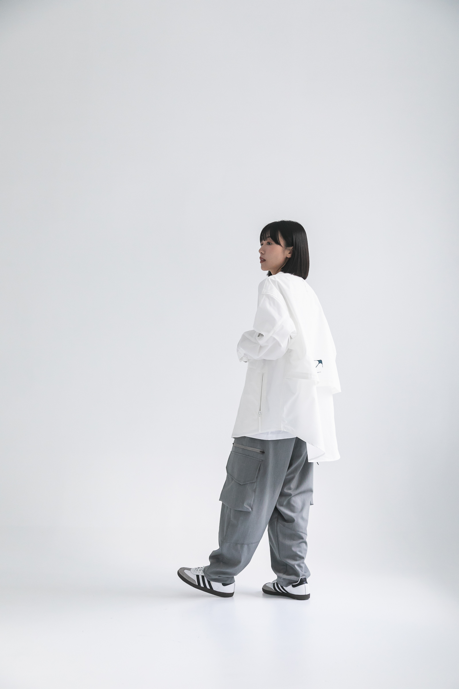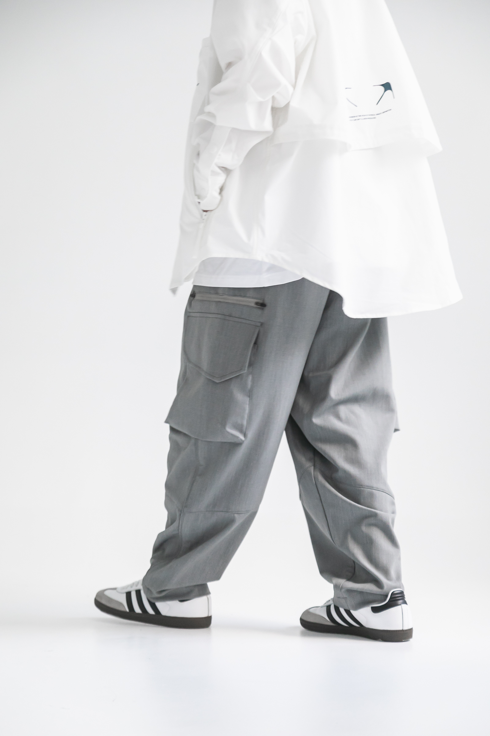 本次作品採67%NYLON、28%的人造棉混紡面料與5%SP彈性纖維,混紡特色在於保有NYLON既有的材質張力之外,擁有棉布材質的透氣性,使主體質地光滑輕柔,配以微寬鬆版型設計,改善棉的特性與增強穿搭的立體性;褲耳處維持腰帶系統並配置塑料D環,迎合面料與材質的視覺接觸;兩側口袋處以彈片式拉鍊設計,給予穿搭簡單隨意的收納空間,簡易隨行於城市之中;口袋兩側則以左側雙開式拉鍊插袋與右側彈片磁吸式口袋,提升整體穿搭邏輯與層次;後側插袋處新增磁吸設計輔以品牌LOGO點綴,在日常儀式感與置物巧思給予穿著者舒適的實著體驗。